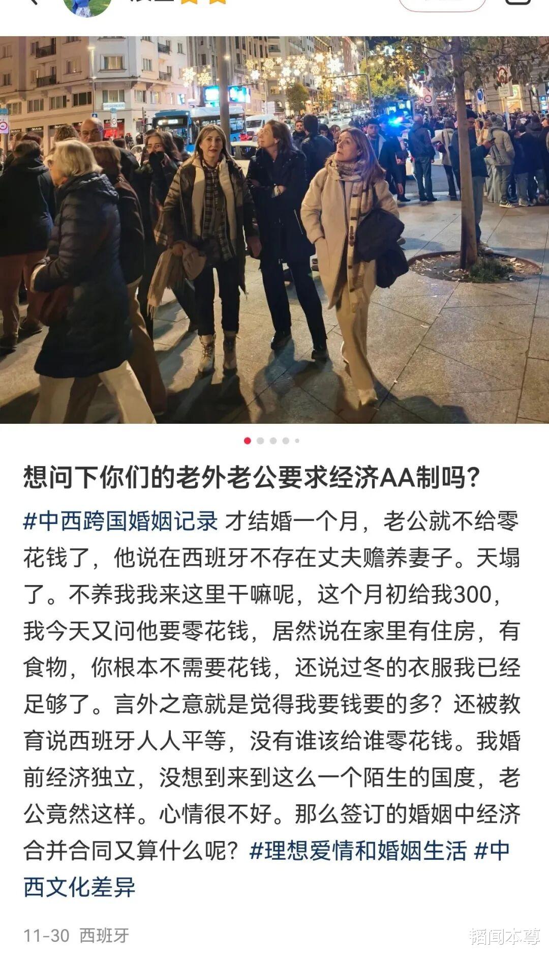 11月30日,她发帖说结婚才一个月,老公就不给她零花钱了。她说她的西班牙老公告诉她在西班牙不存在丈夫养妻子。她说11月初给了她300的零花钱,可今天又要零花钱时,她丈夫说她根本就不需要零花钱。她还被教育西班牙人人平等,没有谁给谁零花钱。她感叹说她婚前经济独立,可来到陌生的国度却成了“这样”,心情很不好。还问之前签订的婚姻中经济合并合同又算什么呢?