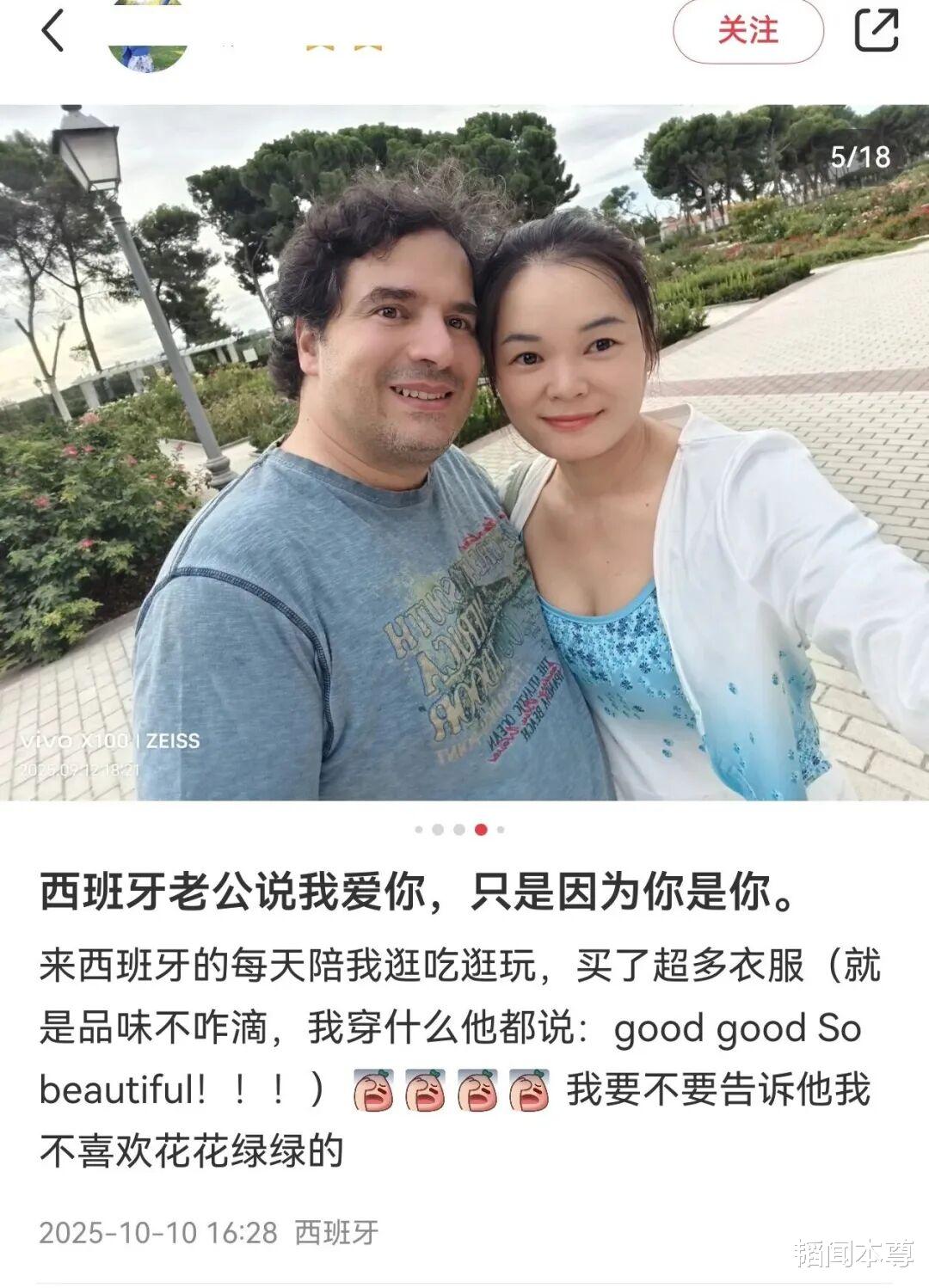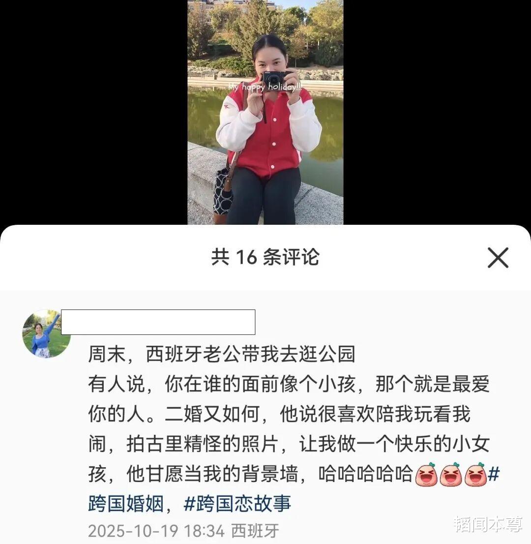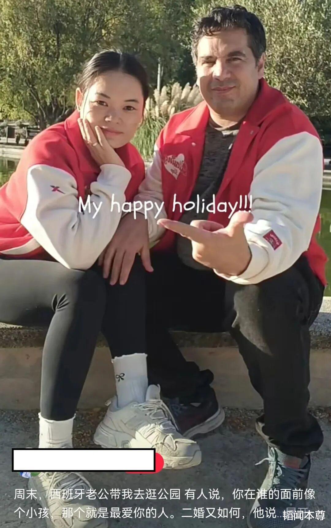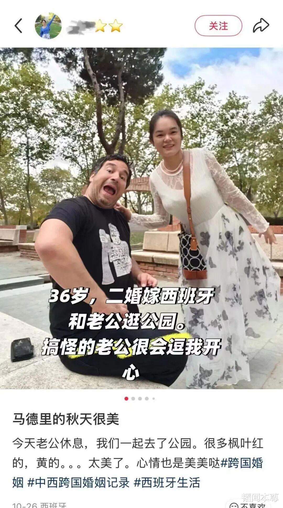 10月26日,她又发帖说她36岁二婚嫁到西班牙,老公很会逗她开心,她的心情美美的。