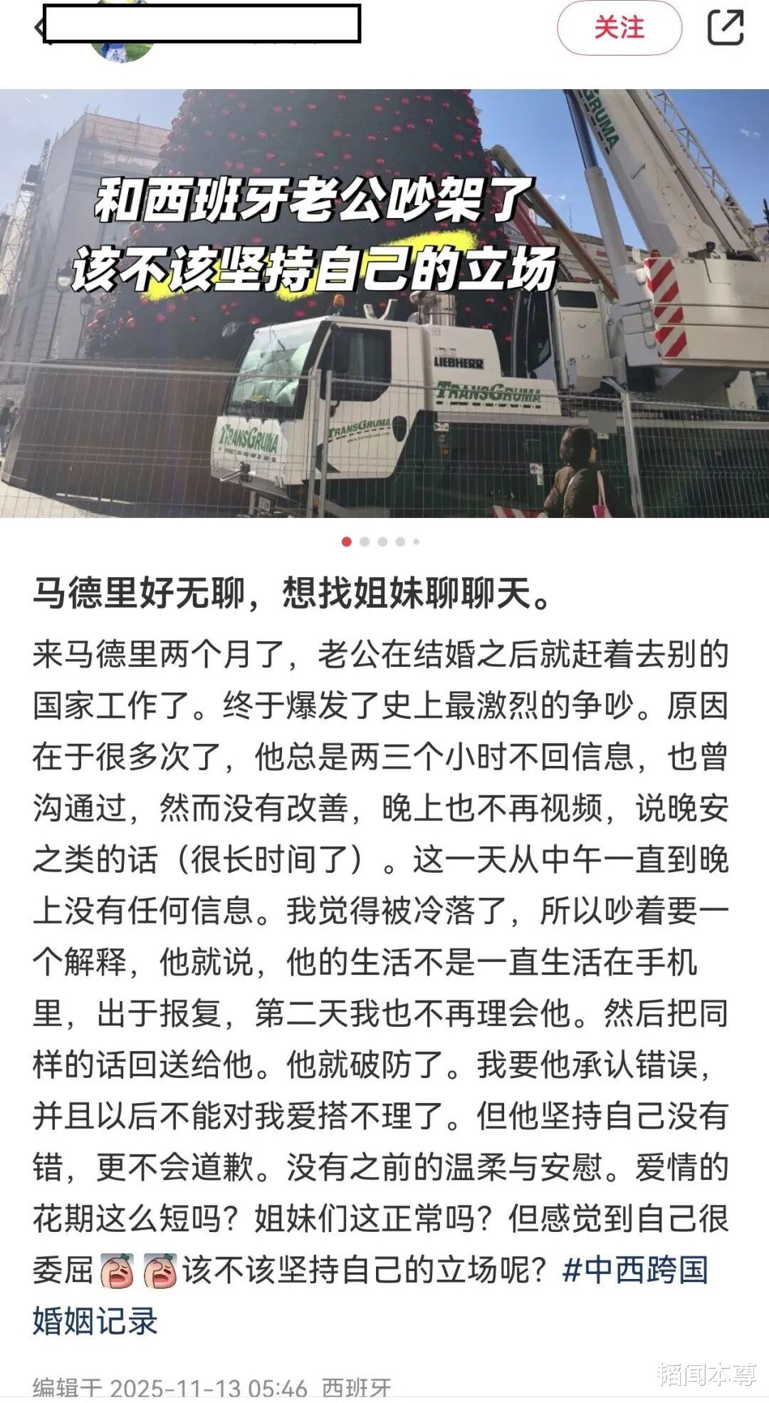 可是,不到一个月之后的11月13日,她的社交媒体账号就画风突变了。因为她发帖说她这才到西班牙二个月,她的西班牙丈夫就去另外一个国家工作了,然后两人就爆发“史上最激烈的争吵”。而且她的西班牙丈夫还不回复她的信息,晚上也不再视频。她问中国的网友们“爱情的花期这么短吗?”