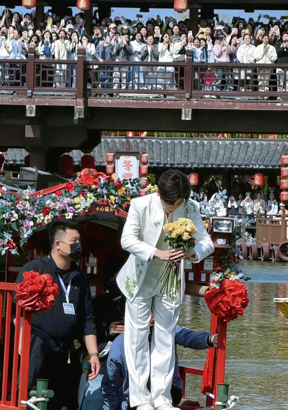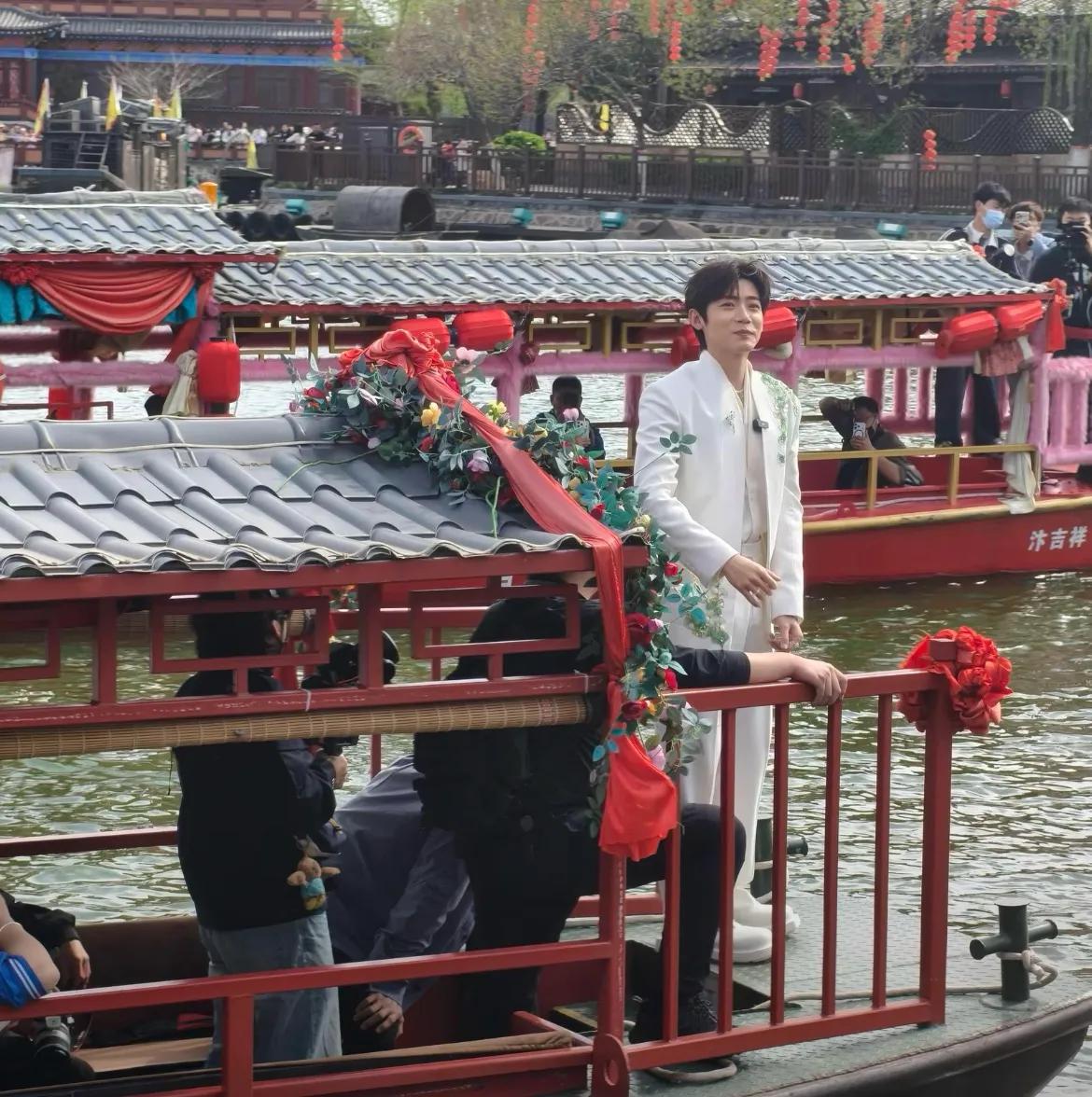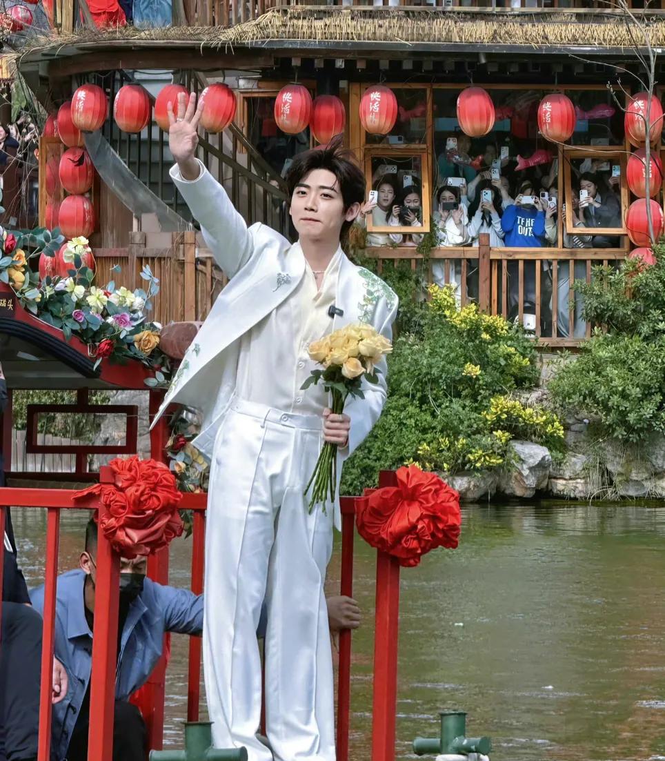 现场,李卿乘坐小船与岸边和桥的粉丝互动,一身白色西装英俊潇洒,温文尔雅,应了大家的那句话,陌上人如玉,君子世无双。现场,与大家互动,可以说是非常有质感,有意境,不少网友感慨,这一趟不虚此行,能够近距离与明星互动,还是非常令人激动的。