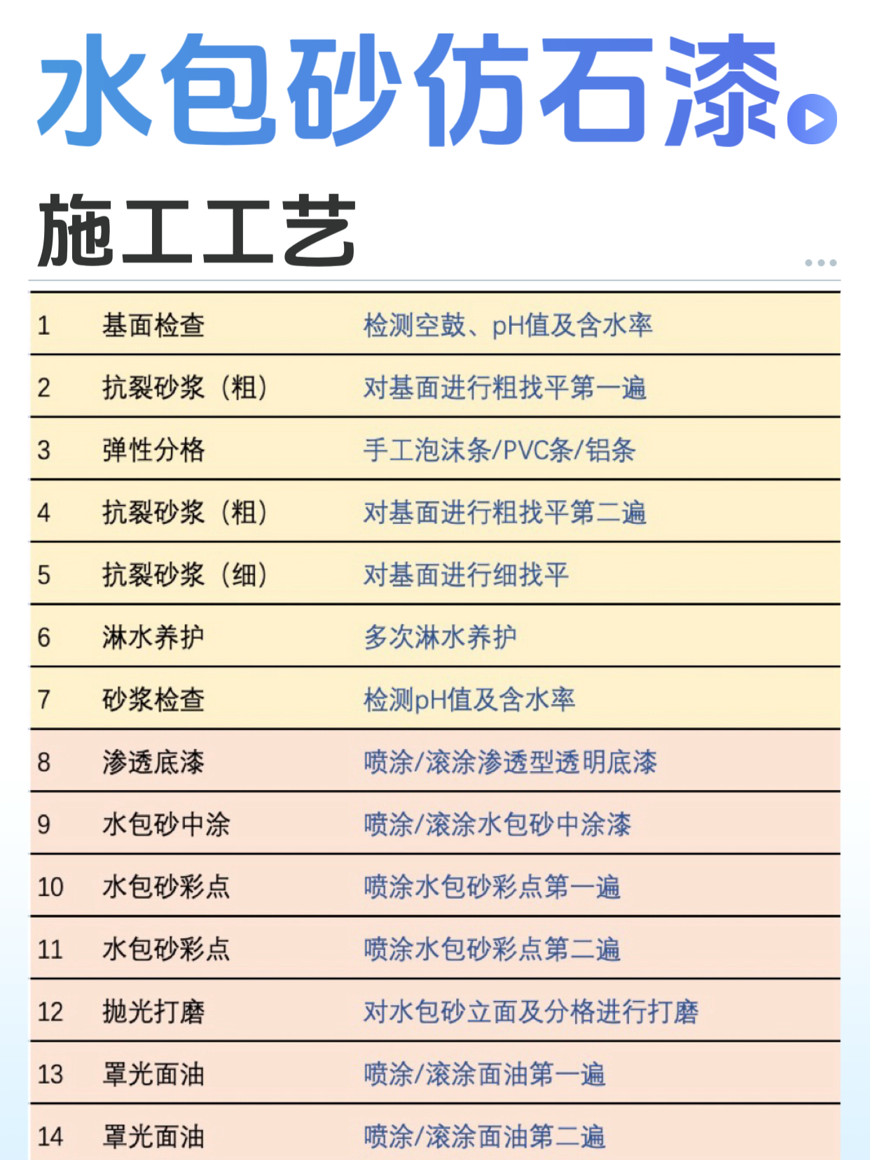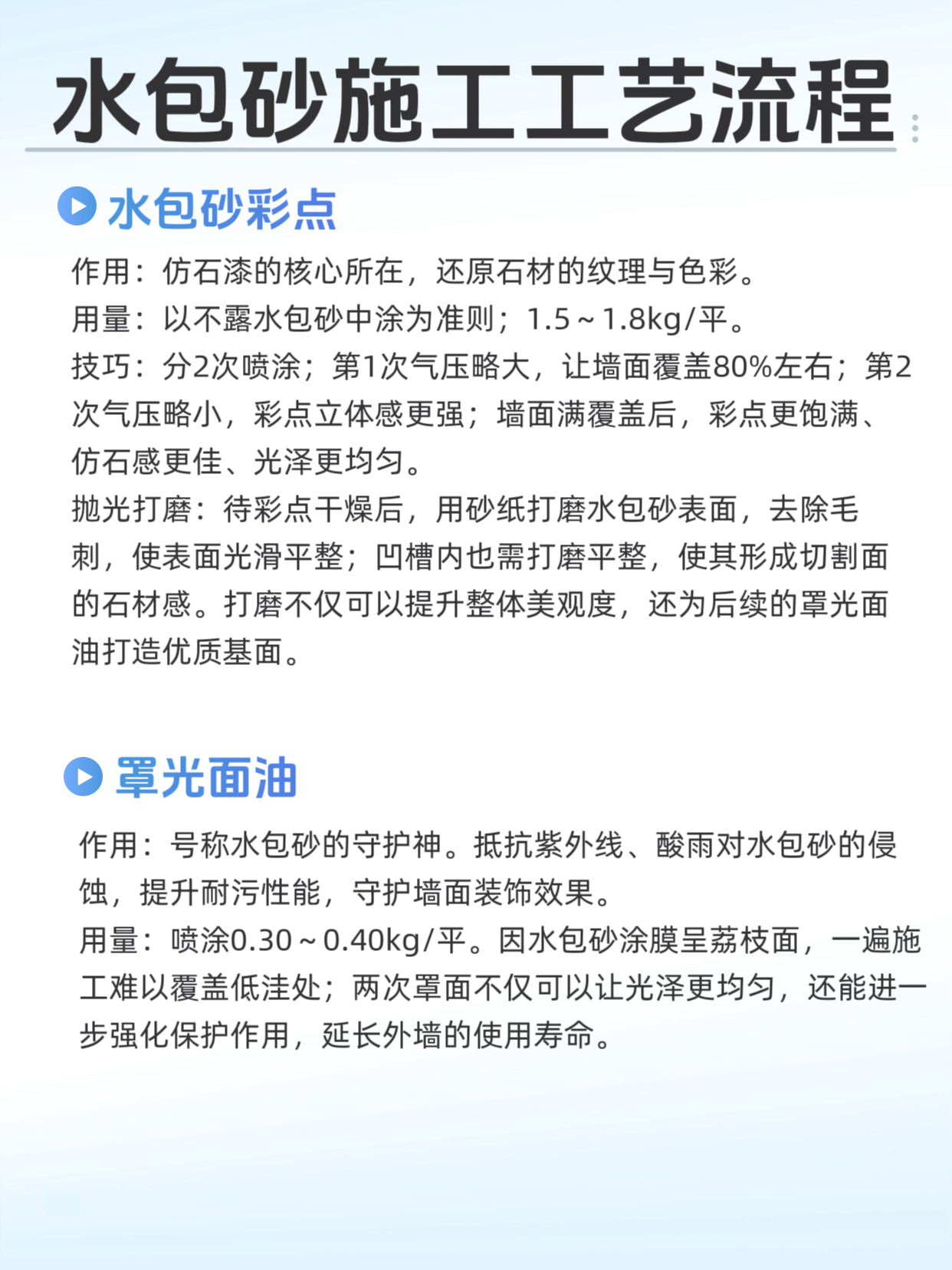 喷涂水包砂彩点,用量1.50〜1.80kg/平;以不露水包砂中涂为基本原则;分2次喷涂效果更佳,喷涂要均匀,避免脚手架印,确保墙面满覆盖。