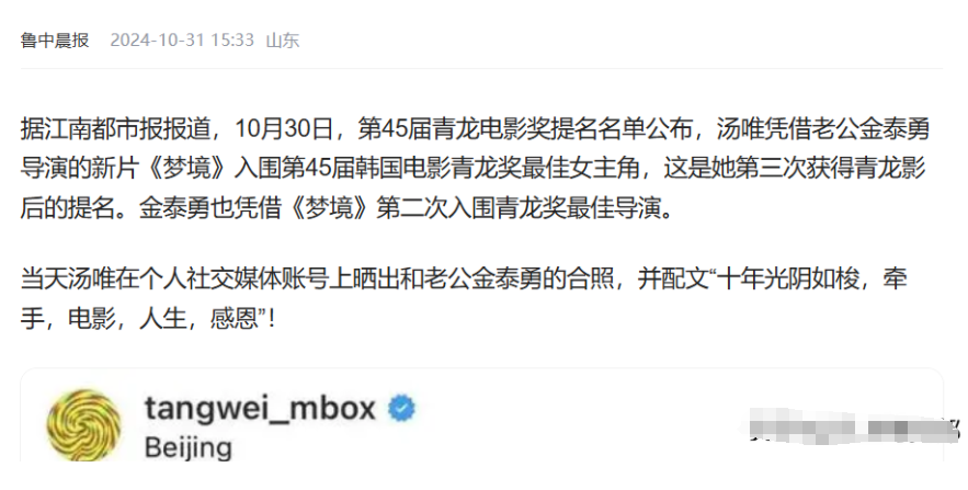 直到汤唯3次入选青龙奖,我才懂,她和金泰勇结婚是多正确的选择