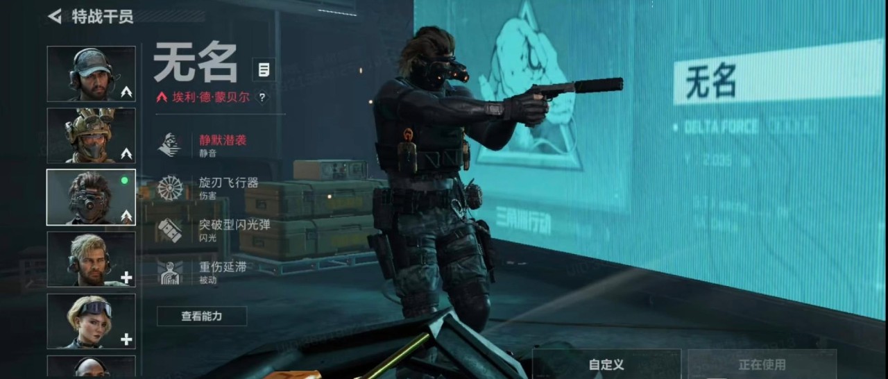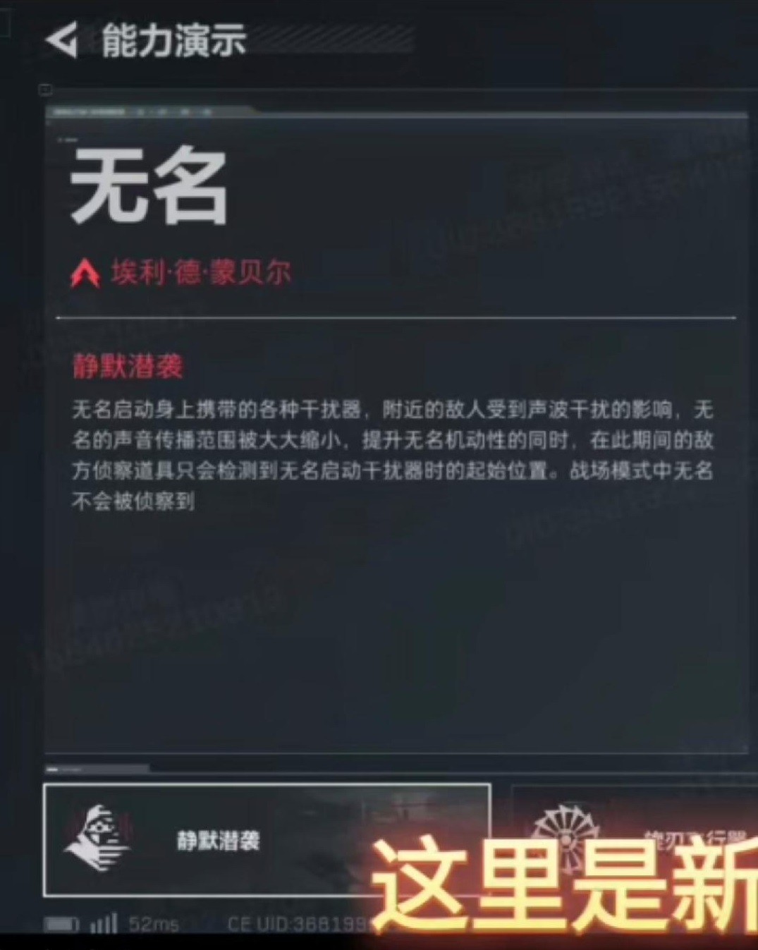 大招:寂静无声,开启后无名动作声音变小,ai对无名索敌范围变小,侦查位技能不会扫出无名。