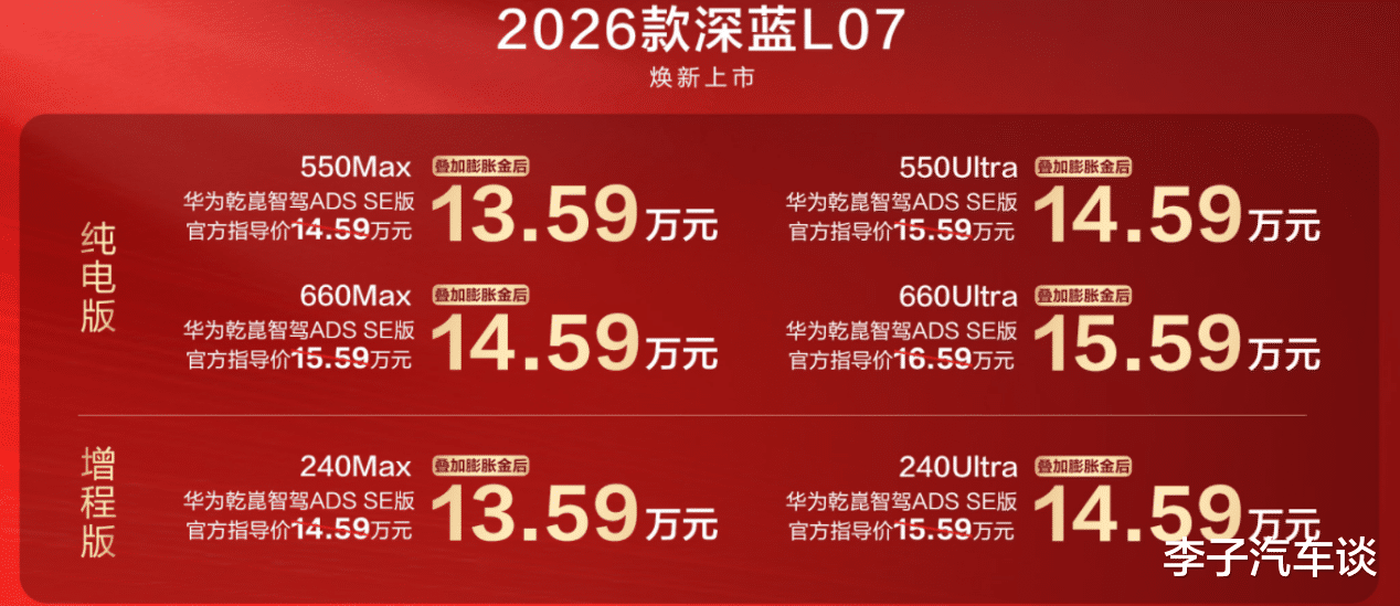 此外,就在8月13日的晚上,深蓝L07还上市了它的2026款车型,新车的售价区间在14.59万元~16.59万元,同时还给出了限时5999元抵扣15999元的膨胀金,所以优惠后的价格更是来到了13.59万元。