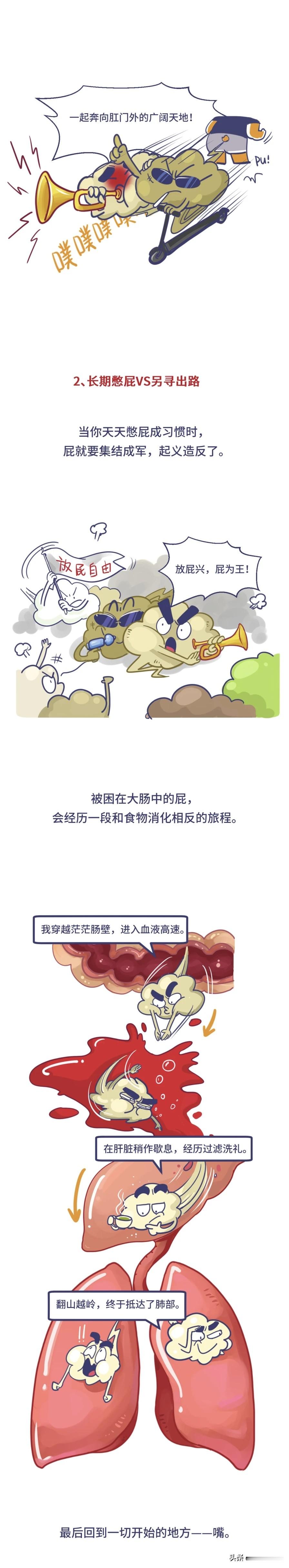乐观情况:气体留在肠道,下次找没人处放出。长期未排:气体被肠道吸收进入血液,随血液循环到肺部,最后在呼吸中悄悄呼出(不是打嗝)。所以 “屁变嗝” 的传说是错的。注意:憋臭屁可能从嘴里呼出,口臭者需警惕消化系统问题。四、如何悄无声息放屁?放屁无法避免,但可从 “臭味” 和 “响声” 入手改善: