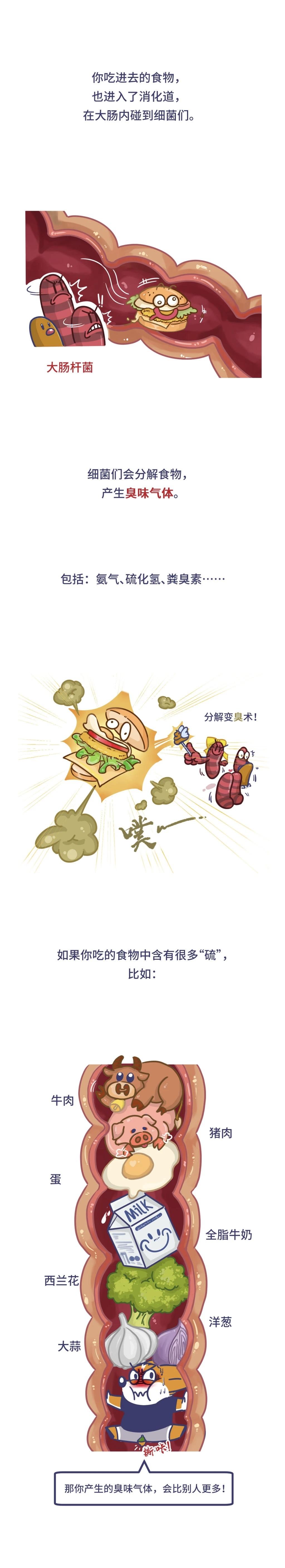 一、身体里的臭气体从哪来?一部分气体是进食吞咽时带入体内的,另一部分则是肠道细菌发酵产生的。当胃肠道气体超过 150 毫升时,会感到胀气,身体会启动排气系统 —— 放屁和打嗝,但它们排出的气体有上下之分。