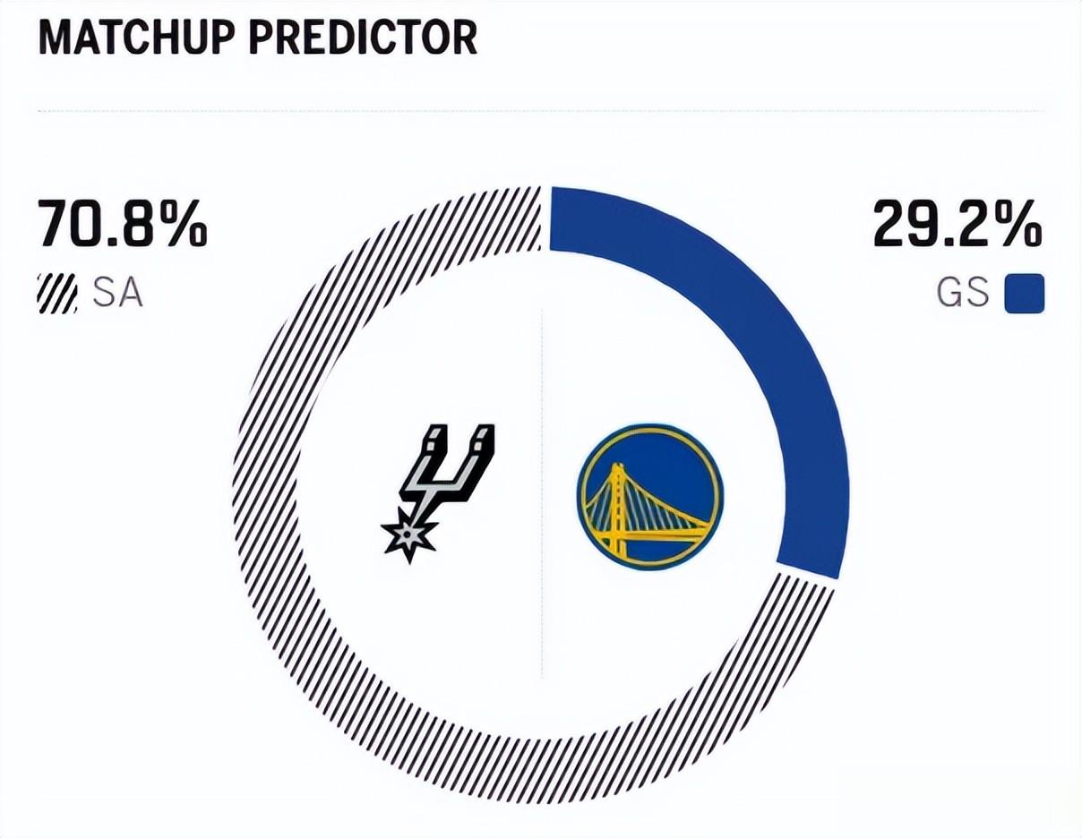 赛前,美媒ESPN对本场比赛进行了胜率预测,马刺队胜率高达70.8% ,勇士胜率则仅有29.2% ,差距非常明显。