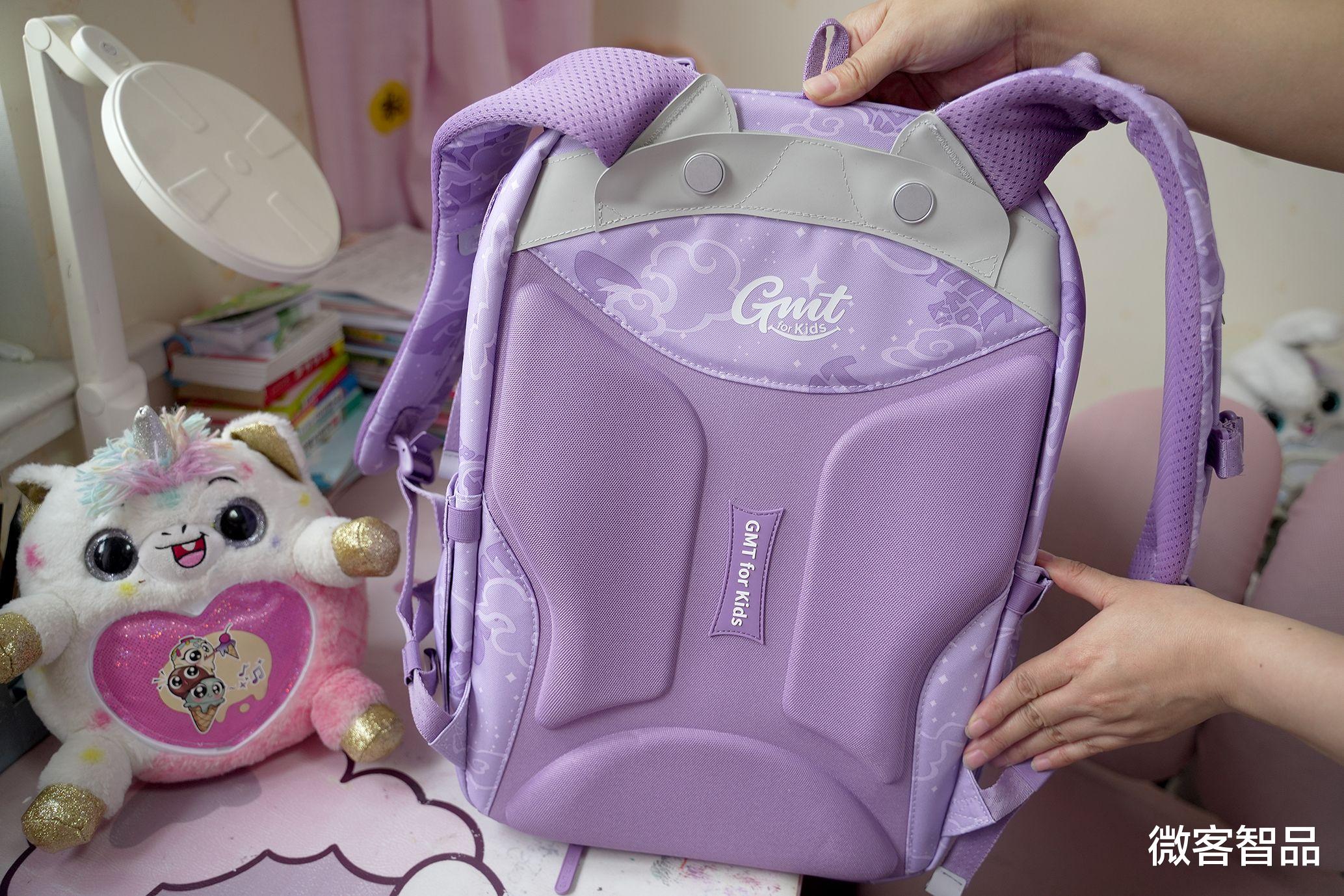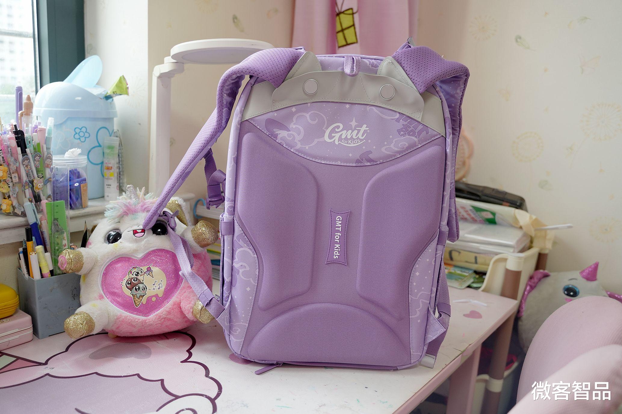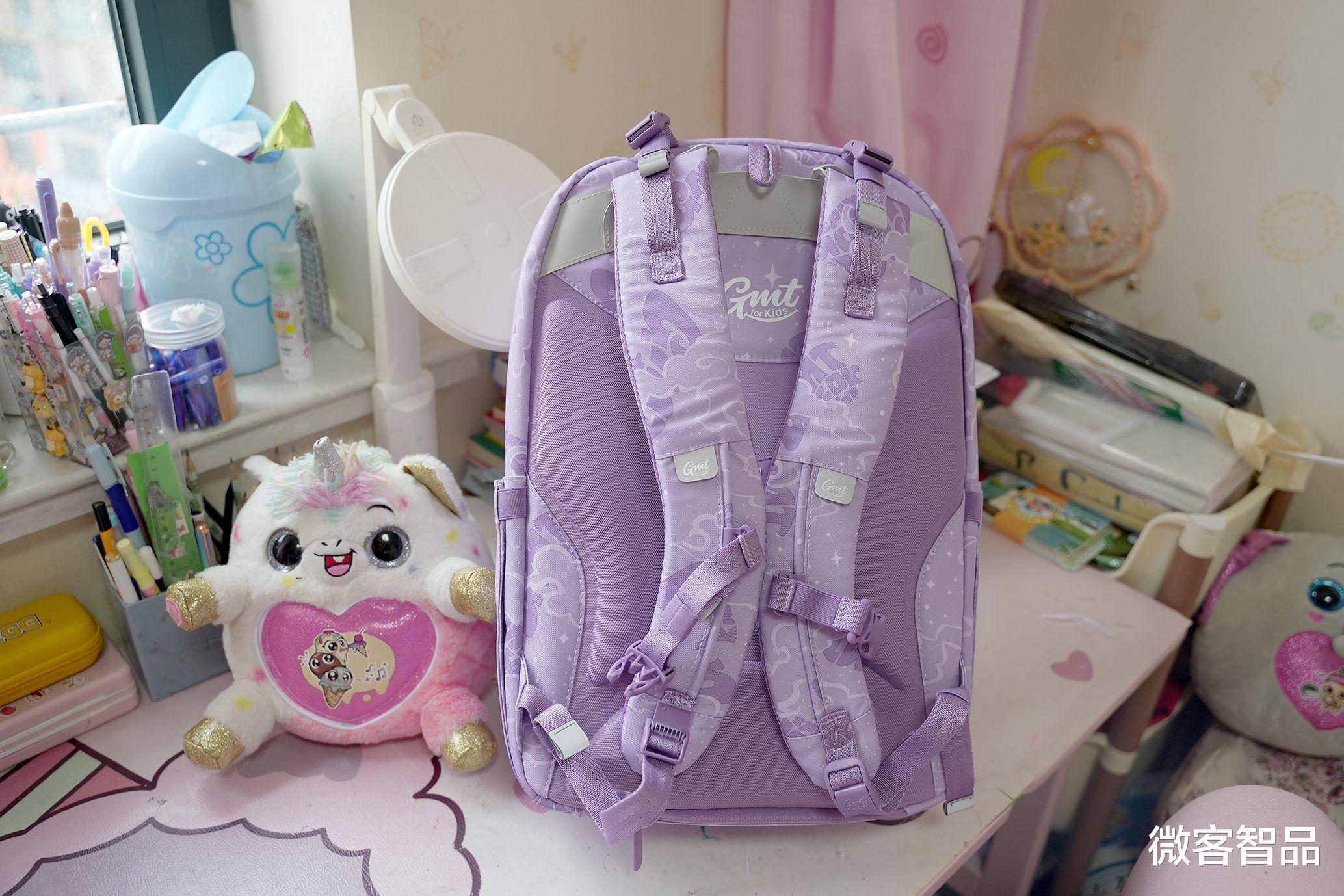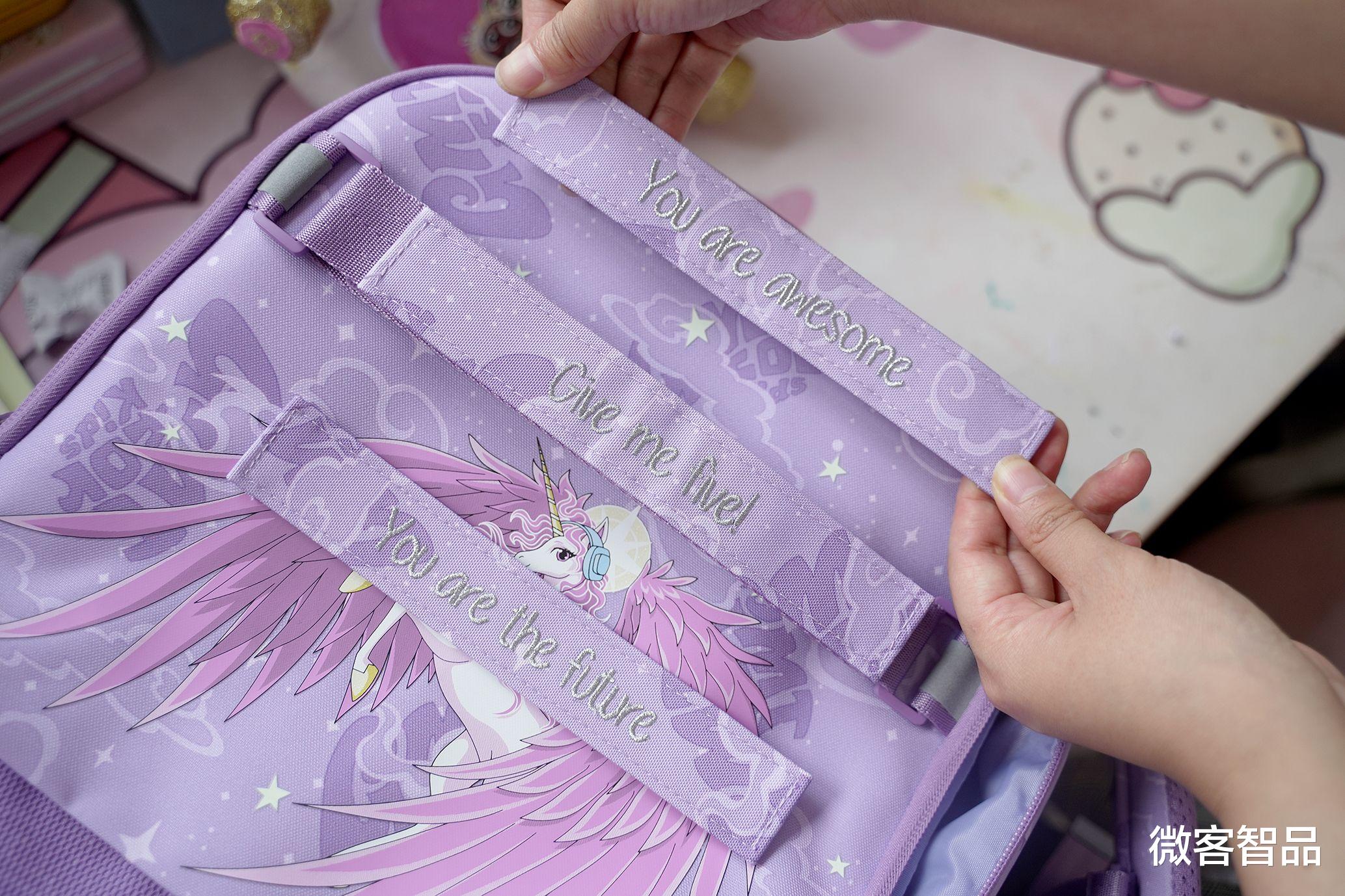 入手的这款GMT for Kids 的Trend系列“幻乐独角兽款”护脊书包,以粉紫色为主色调,融入渐变星空元素,不仅整体看上去有幻彩渐变的视觉效果,而且表面采用RPET环保材质,防泼水、防污、防油,它还通过欧洲REACH安全认证,且能抑制大肠杆菌等常见细菌。