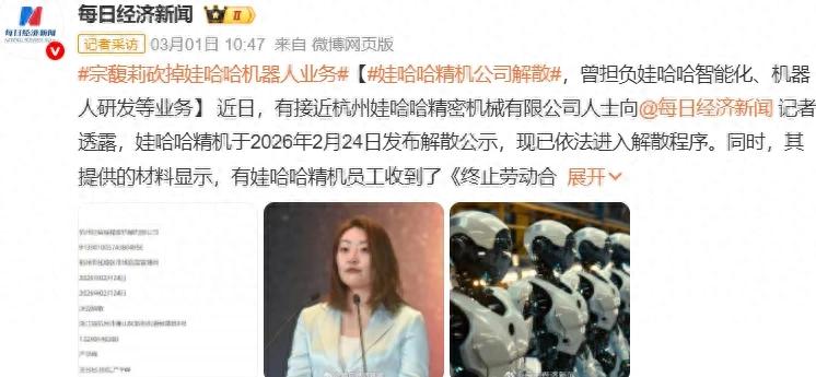 2月24日:娃哈哈精机成立清算组,发布注销公示,原因决议解散;2月26 日:200名员工收到终止劳动合同通知;3月2日:员工向媒体证实,公司已进入解散程序,暂无书面赔偿协议。