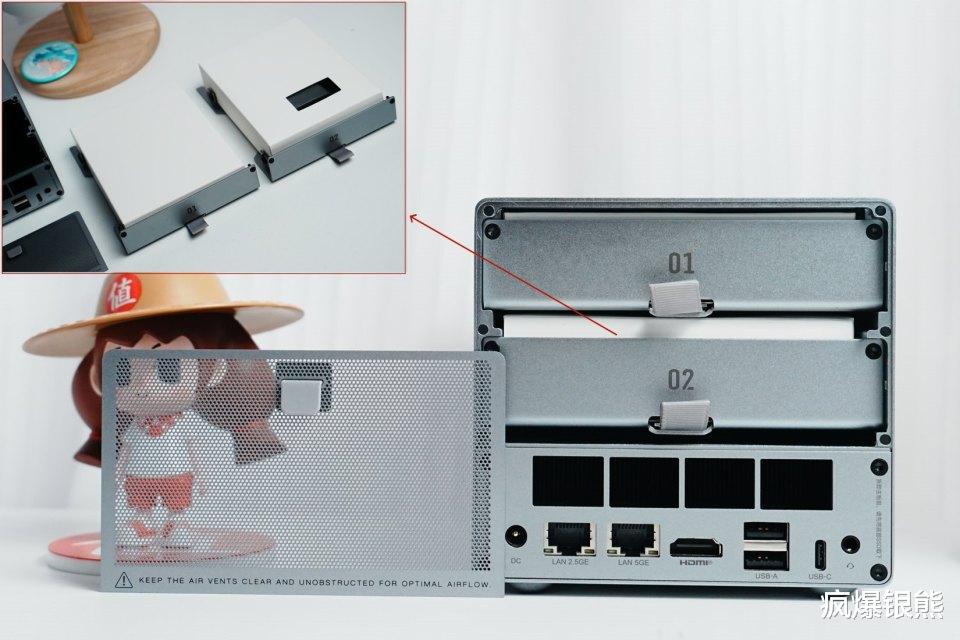 接口上方是散热鳍片,散热鳍片上面是磁吸式网罩,网罩打开后内部是两个3.5英寸的HDD硬盘仓(单盘位最大支持30TB容量扩展),除了支持3.5英寸硬盘外,2.5英寸硬盘也能使用。