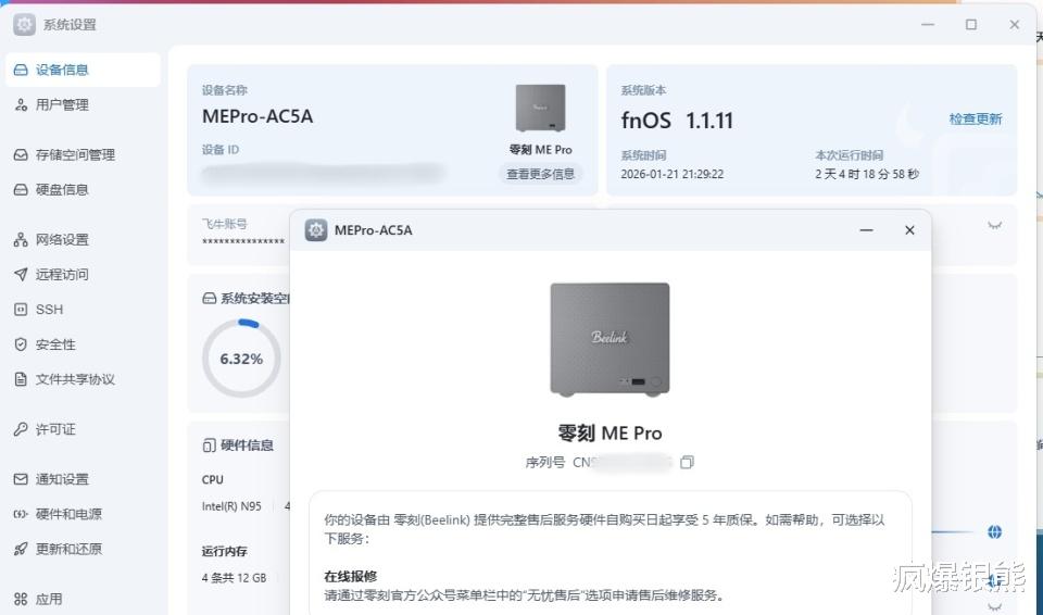 零刻 ME Pro硬件方面其配置也不差,英特尔N95处理器采用4核4线程,最高睿频3.4GHz,在零刻优化下最高达功率可达25W,解码4K视频,应对文件转码、远程访问等轻松无压力。不同于其他品牌,其板载的12GB LPDDR5 4800MT/s内存在性能上比DDR4要高不少,另外额外赠送的5年商业会员(自带终身免费中继服务),每月可享受500GB高速官方转发流量,最大限速 12Mbps,不限制连接终端数量,对于有远程操控及观看NAS影片需求的用户而言还是非常方便的。