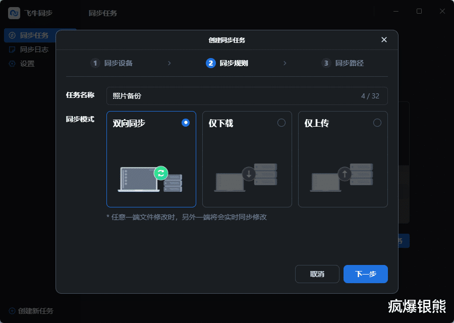 在文件/照片备份和存储上,对于PC端用户,飞牛专门为Windos用户和Mac OS用户专研了飞牛同步这个软件。打开后我们可以选择双向同步、仅下载或者仅上传,设置好后软件就会根据用户需要把相应文件备份到NAS上,非常的简单。