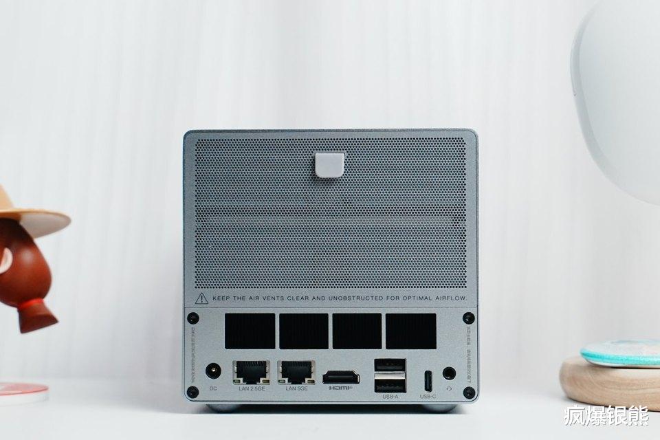 背面接口设计有一个DC电源接口、一个2.5G网口、一个5G网口、一个HDMI(4K60Hz)、两个USB-A(480Mbps)、一个USB-C(10Gbps)及一个3.5音频接口。
