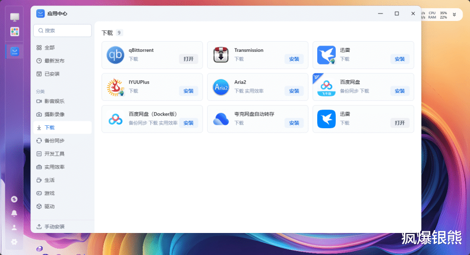 电影好看,也要好下载才行,为了方便用户获取资源,飞牛OS中也内置了多种下载软件(迅雷、qBittorrenbt、Transmission、Aria2、IYUUPlus等)和各种网盘备份功能,这些下载工具虽然很多都是Docker应用,不过飞牛已经把自动安装配置融入到了系统中,我们只需点击下载,然后就能随意使用了,无误用户复杂配置,相较于其他传统NAS而言,对于新人而言方便了太多。