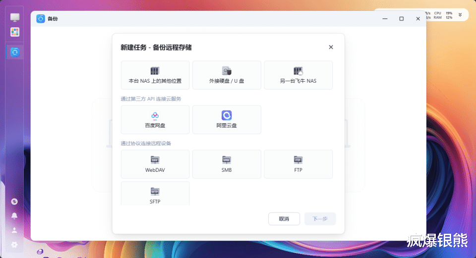 除了飞牛同步这个软件,飞牛OS上还有一个备份功能,该功能专为备份各类资料而生。通过该软件我们可以轻松的将NAS上的内容备份到外接硬盘/U盘,另一台飞牛设备,百度网盘、阿里云盘及通过多种协议链接到NAS的远程设备。