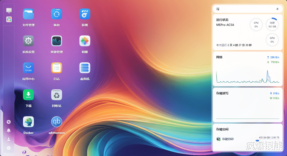 在系统UI方面,fnOS给人的感觉也是很清爽的,有种安卓平板的意思。桌面信息展示上也蛮到位,左侧是所有功能图标,左下角还有设置、用户和通知、任务快捷操作按钮。右侧有可以收纳展示的信息栏,能实时展示运行状态、网络和读写速度、存储空间剩余量,逻辑清晰直观,不输大牌NAS厂家的系统。