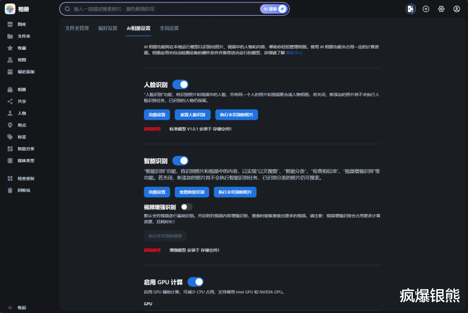 另外飞牛的相册中也内置了AI功能,开启后可智能识别人脸和文字、图片类型等,识别后的照片可以根据类型进行分类,方便用户查看。