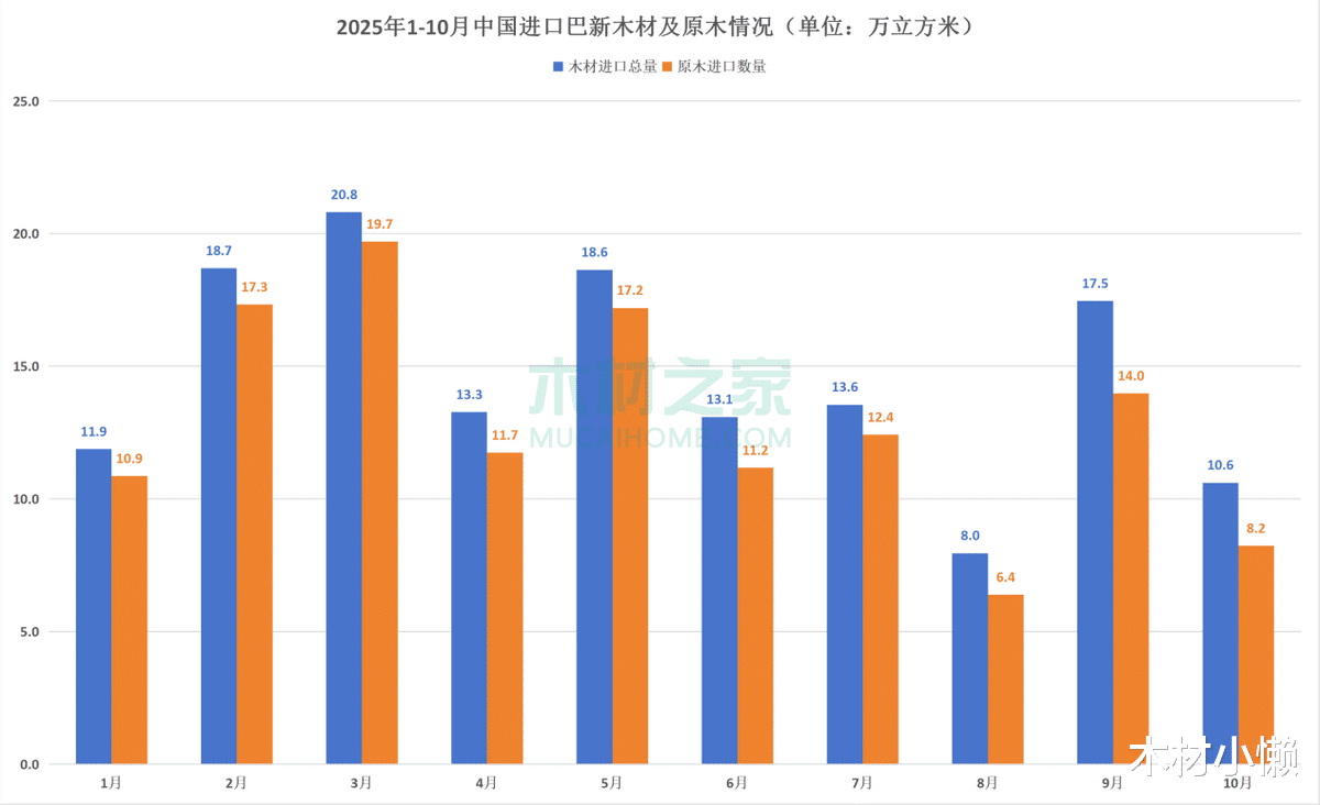 截至2025年10月,巴新对中国的原木出口量维持在128.99万立方米,占其对中国木材出口总量的93%,在中国原木进口来源地中稳居第三位。