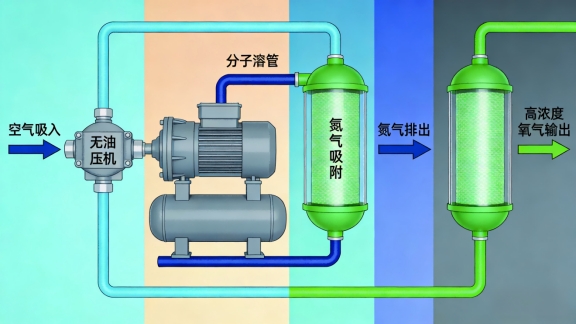 制氧机的核心作用就是缓解密闭环境缺氧,原理很简单,就是把空气中的氮气分离出去,提取高浓度氧气。