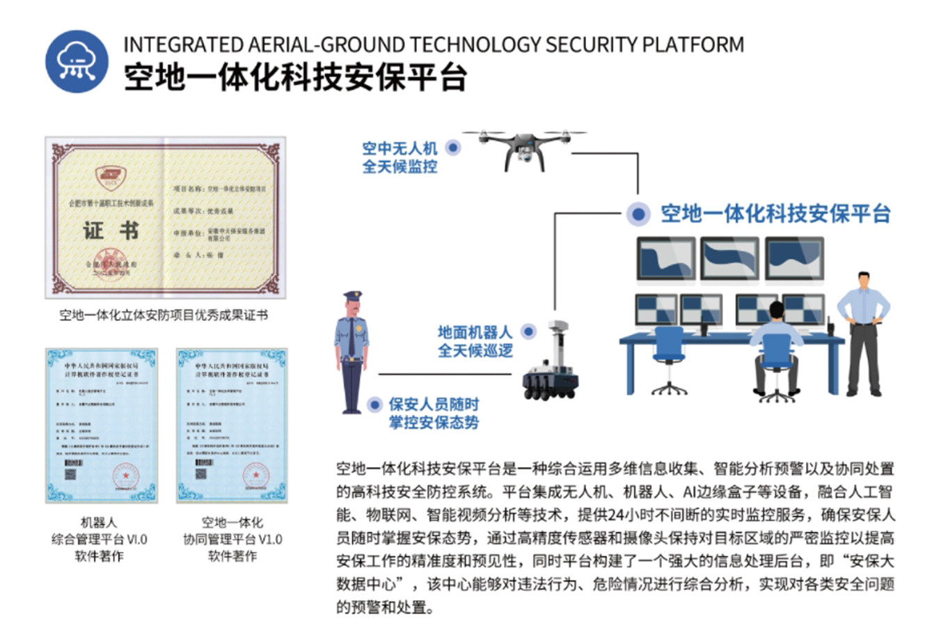 中天保安集团始终坚持科技赋能安防,服务守护平安。本次入选的“空地一体化立体安防平台”是中天保安集团打破传统安防“地面单一防控”的局限,融合无人机巡检、地面智能巡检机器人、视频智能分析、物联网感知等多项核心技术,构建起“空中巡查+地面防控+智能预警”的三维立体安防网络。通过数据互通、协同联动,实现了对防控区域的全方位、无死角覆盖,大幅提升了安全隐患识别效率与应急处置响应速度,为各类大中小型企业、机关单位、产业园区、城市综合体等场景提供了更高效、更智能的安防解决方案。