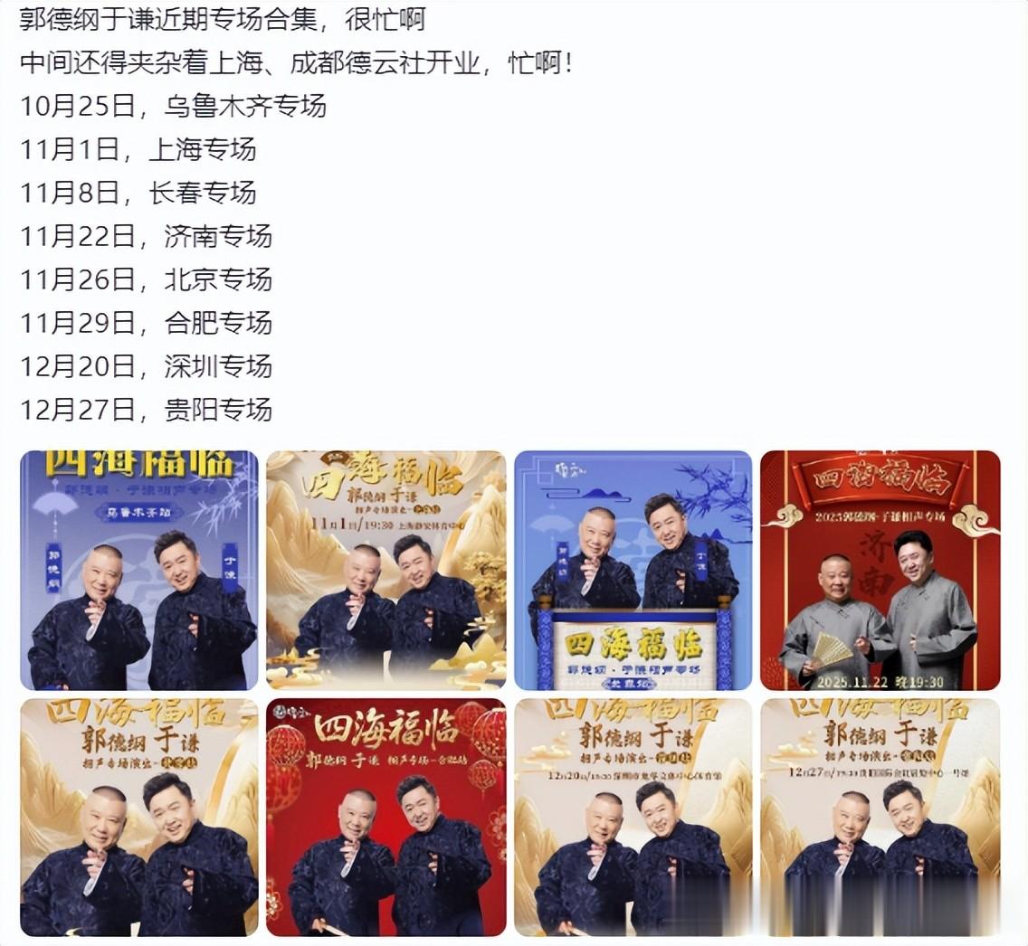 德云社郭德纲发文,晒出一组九宫格照。照片与乌鲁木齐专场有关,不同角度的观众席照,满满的都是人。在文案中,郭德纲说到,乌鲁木齐站,又圆满成功了,至于干嘛说又呢?郭德纲用笑脸给了回应。十月份,郭德纲发了四个文案,都与什么事情有关呢?乌鲁木齐站的演出,助演都是哪几位呢?郭德纲商演,票房、上座率都很有保证,为什么还要晒照呢?新剧杀青,郭德纲接下来行程如何安排呢?