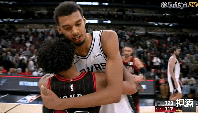 比赛结束,两队球员很友好,在场上互相拥抱致意,文班更是主动走过去,一把抱住武切维奇,今天完全将武切维奇打爆了,赛后抱一抱给个安慰。