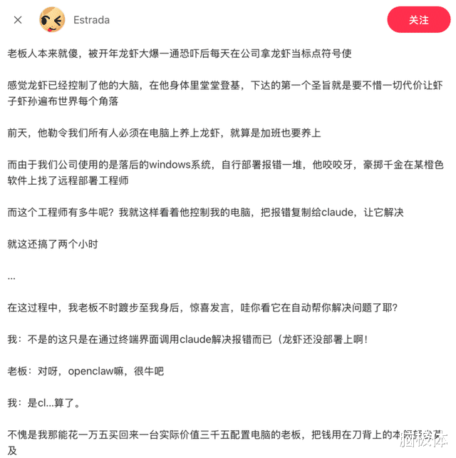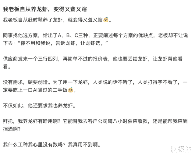 在这一刻,员工完成了双重糊弄:既用了AI工具交差,又向老板证明了自己的判断力高于龙虾。