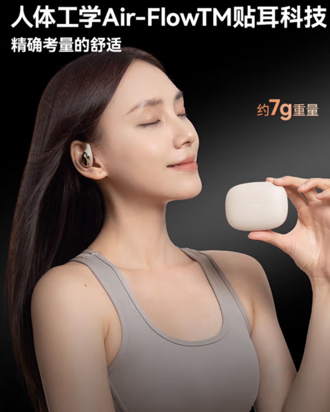 它基于上万组耳廓建模数据优化的挂耳曲线,配合31°仿生悬浮倾斜设计,刚戴上时竟有种“轻舟已过万重山”的轻盈感——航空级超弹记忆钛合金框架像有记忆般贴合耳后轮廓,医用级生物硅胶接触皮肤时温润亲肤,既没有入耳式的压迫感,也没有传统挂耳式的夹耳问题。