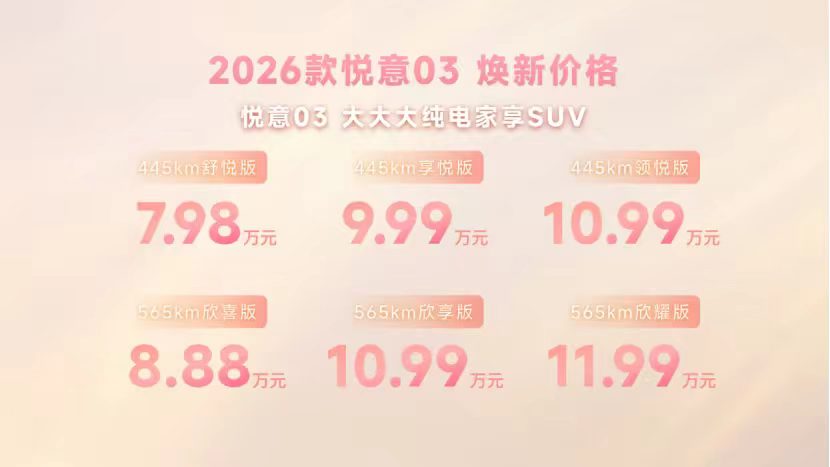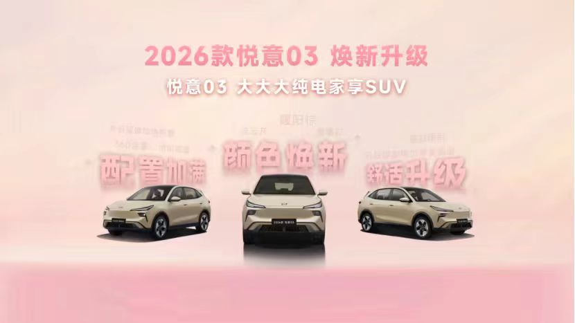 三月春暖,悦见花开。3月8日妇女节,实力演员张若昀直播助阵,“大大大纯电家享SUV”焕新而来,2026款悦意03挚爱上市,为每一位女神献上春天的礼物。445km、565km两种续航共计6款车型,官方售价7.98-11.99万元。围绕年轻小家庭,尤其是家庭女性用户的进阶需求,从颜色推新到舒适满配,2026款悦意03带来全新晨晖金车色、晨曦白内饰色等20余项升级,让用车更舒心、开车更省心、养车更安心,正如张若昀所说:“悦意03是真舒适的纯电SUV。”当前购车还可享7年0息贷款、无门槛整车及三电终身质保等丰富权益,轻松开启高品质纯电生活。