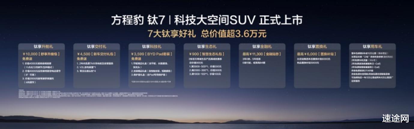 在购车权益上,方程豹更是诚意十足,为首批车主带来了总价值最高超3.6万元的7大钛享好礼!其中包括:覆盖多项座椅舒适配置的总价值10000元舒享升级包、价值3599元的BYD Pad套装、价值4500元的新车交付礼包均免费送;提供3年0息、5年低息、0首付起或至高84期等多重金融方案以供选择,金融贴息最高价值11300元;还有最高价值6000元的置换补贴、价值900元的智慧生态礼包,以及2年5G每个月的免费车机流量、非营运车辆长达6年或15万公里的整车包修、“三电”系统的终身保修、终身免费系统OTA升级等,让每一个家庭都能轻松拥抱钛7,让美好生活触手可及。