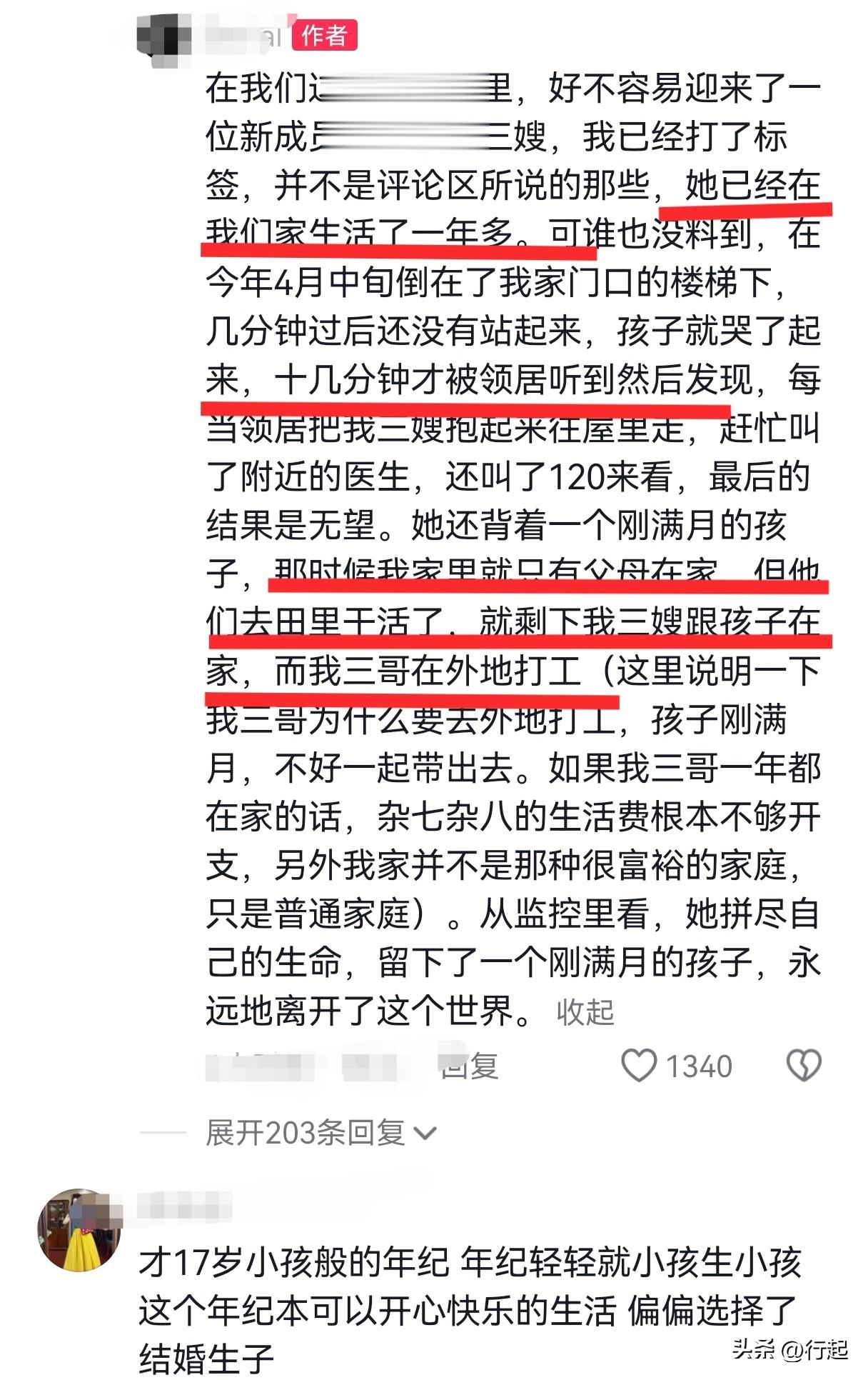 根据博主的透露,她的三嫂今年17岁,已经在他们家生活了一年多,孩子刚满月。可谁也没有想到,后来三嫂会倒在家门口的楼梯下,当时家里只有父母,但是都去田里干活了。
