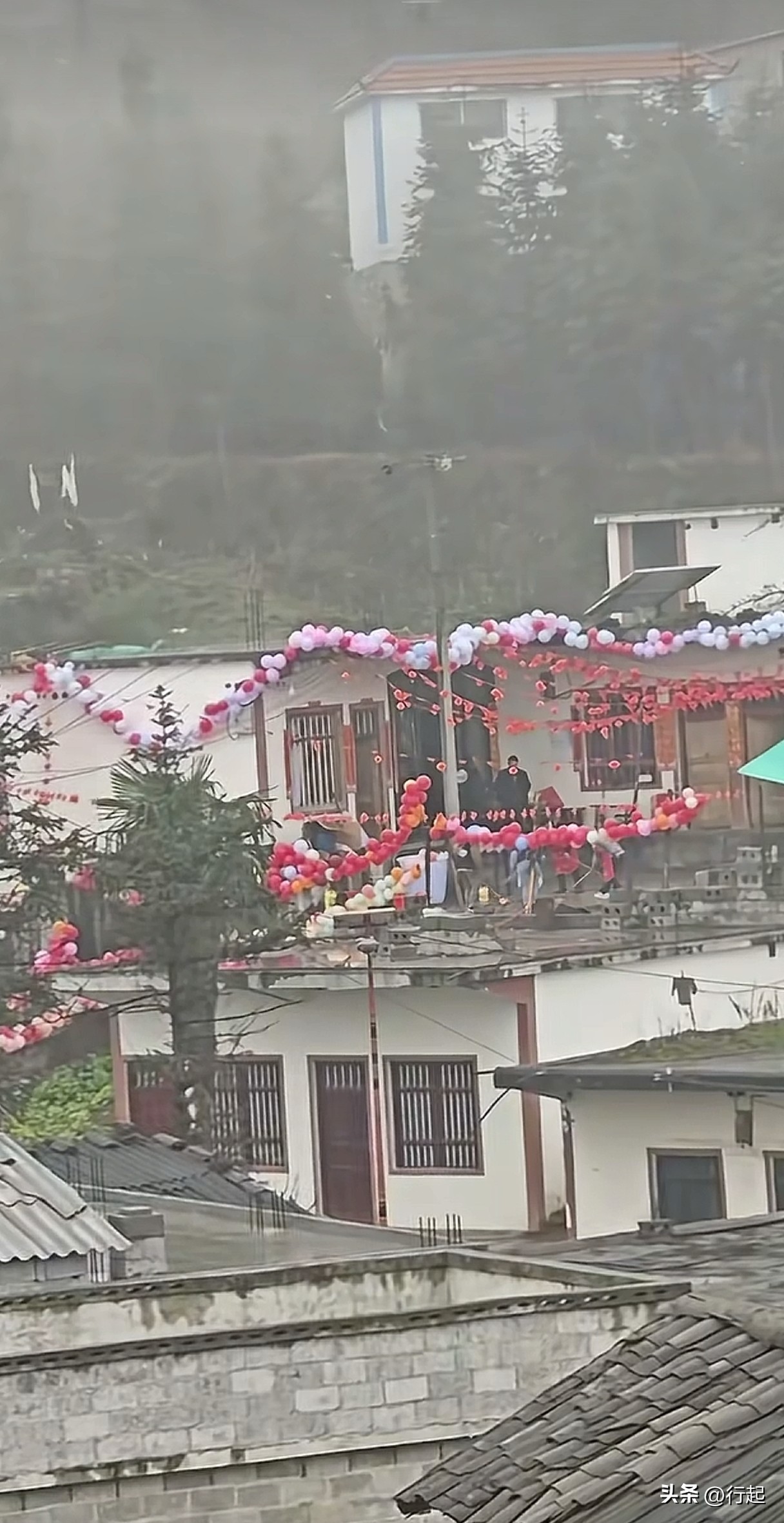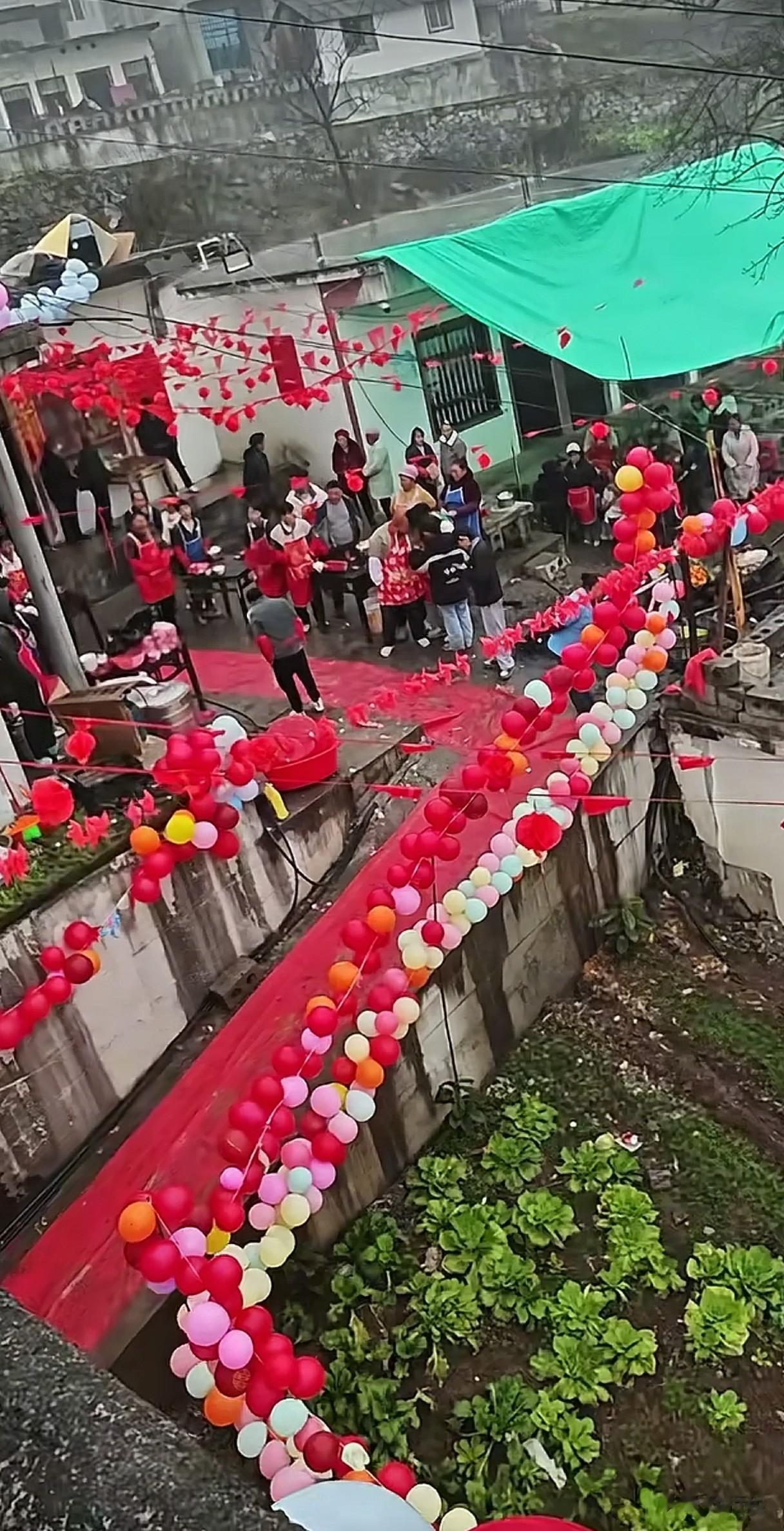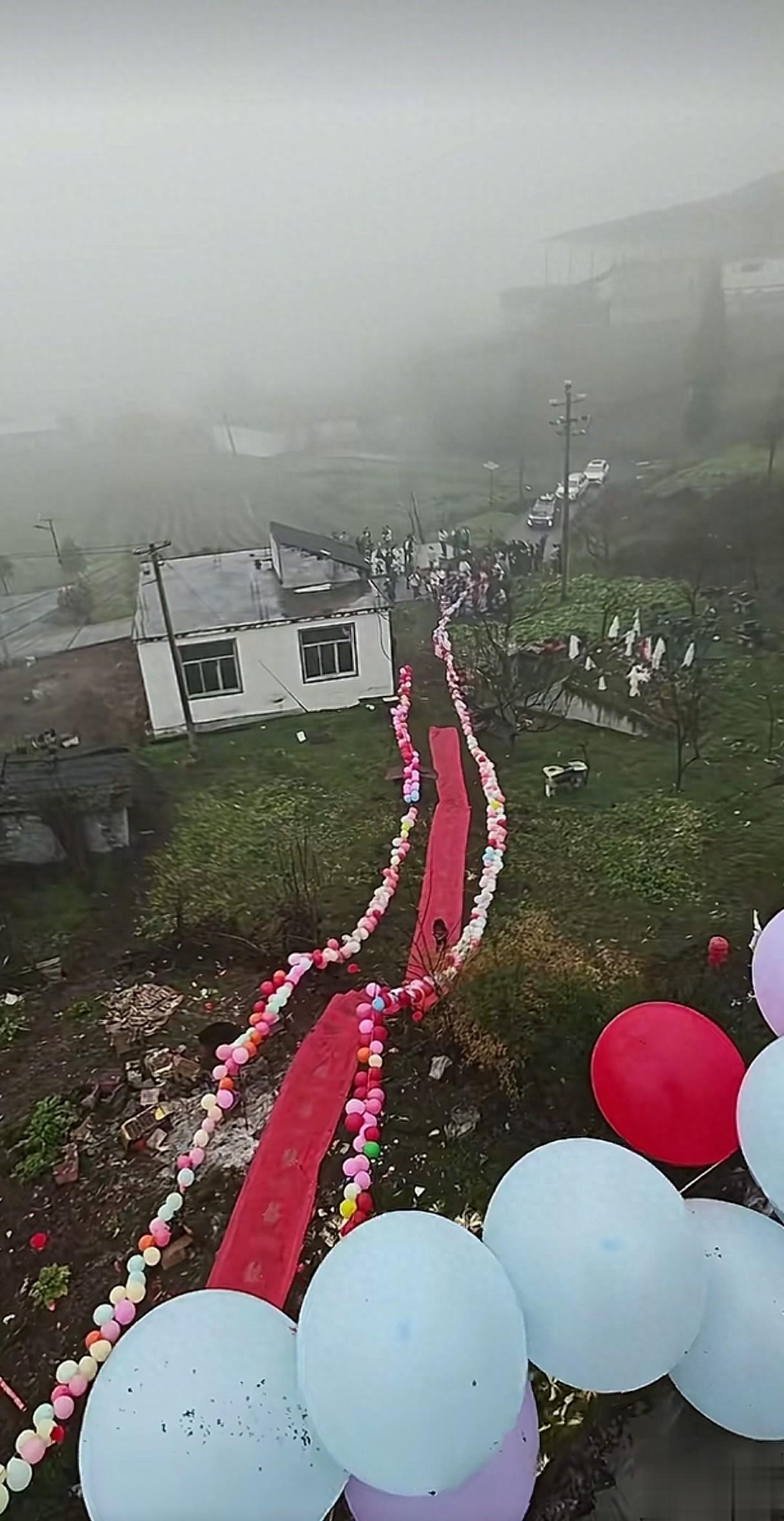 在他发布的那条视频里,我们可以看到三哥和三嫂当时结婚时的热闹场景,家门口摆着长长的红地毯,道路两旁放满了气球,几辆婚车慢慢开了进来。