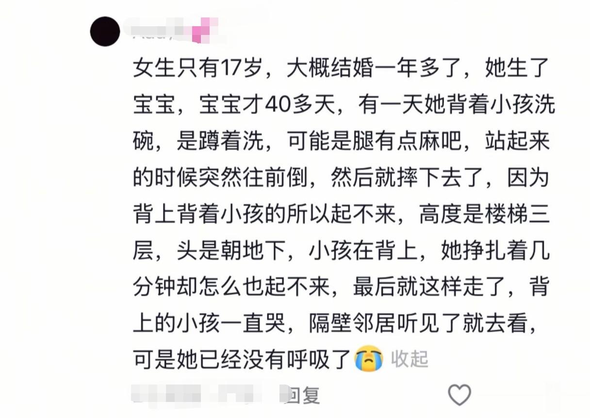 有知情人在评论区给大家补充了更完整的细节,原来是孩子妈妈背着小孩洗碗,是蹲着洗的,站起来的时候可能腿有点麻,然后起身的时候突然往前倒,就摔了下去。