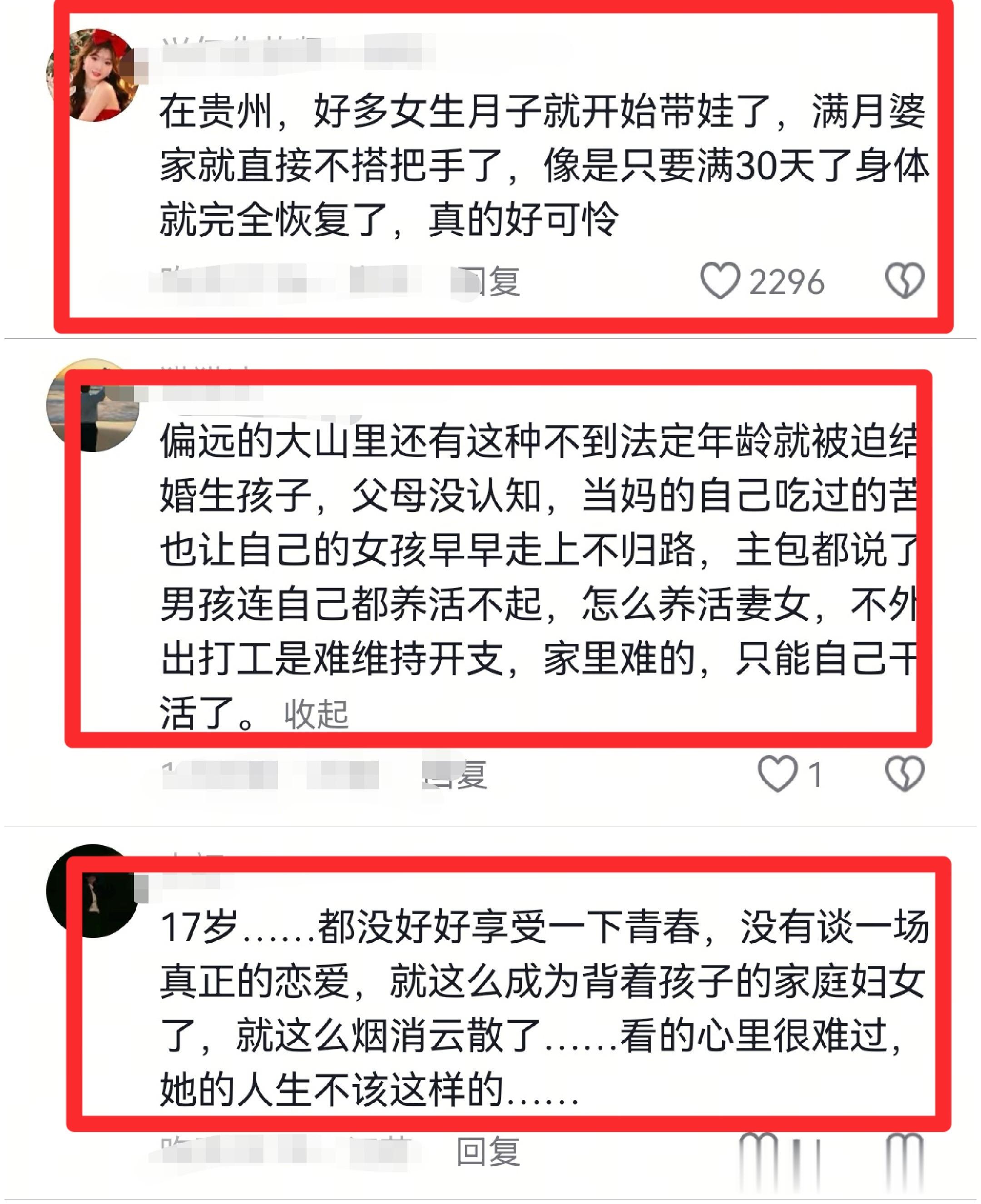 这件事在网上引发了热烈讨论。很多网友不理解:“为什么17岁就要结婚生子?”“为什么刚出月子就要干活?”“家里人为什么不帮忙?”