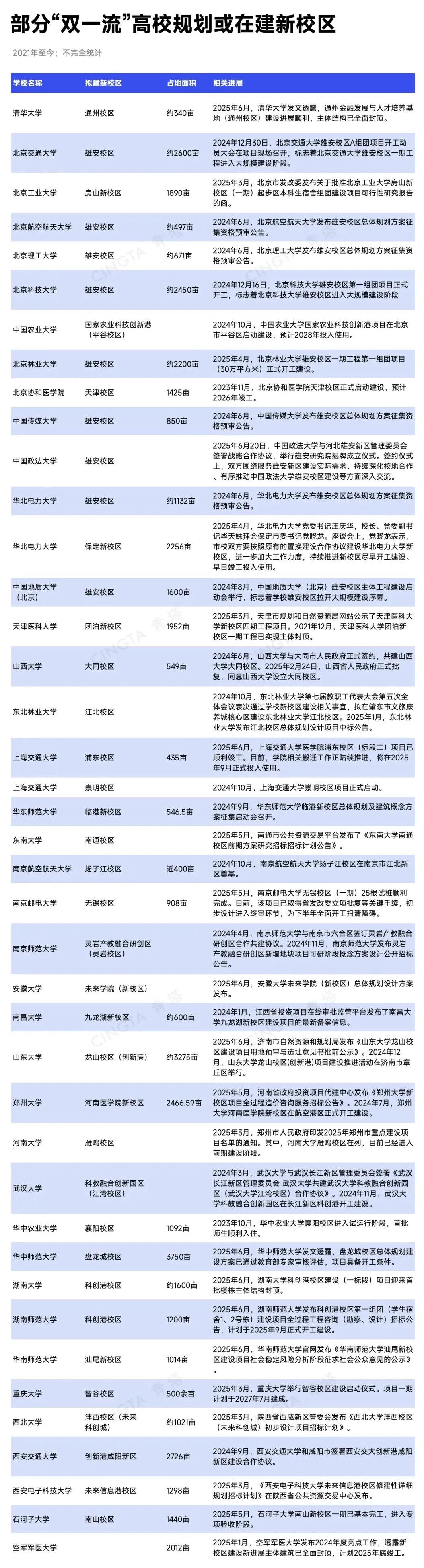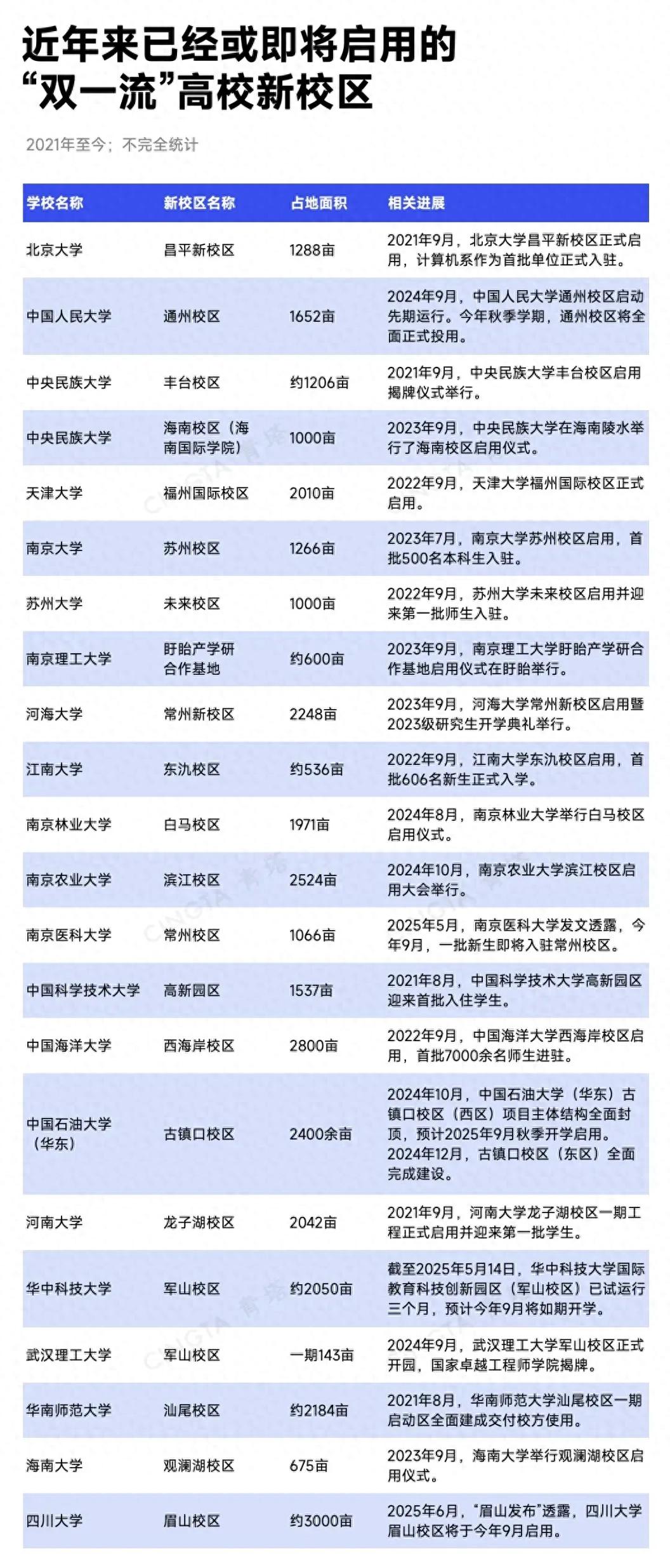 除此之外,包括山东大学、湖南大学、武汉大学在内的多所知名高校也在积极推进新校区建设。国内“双一流”高校正迎来新一轮的校区扩建热潮。