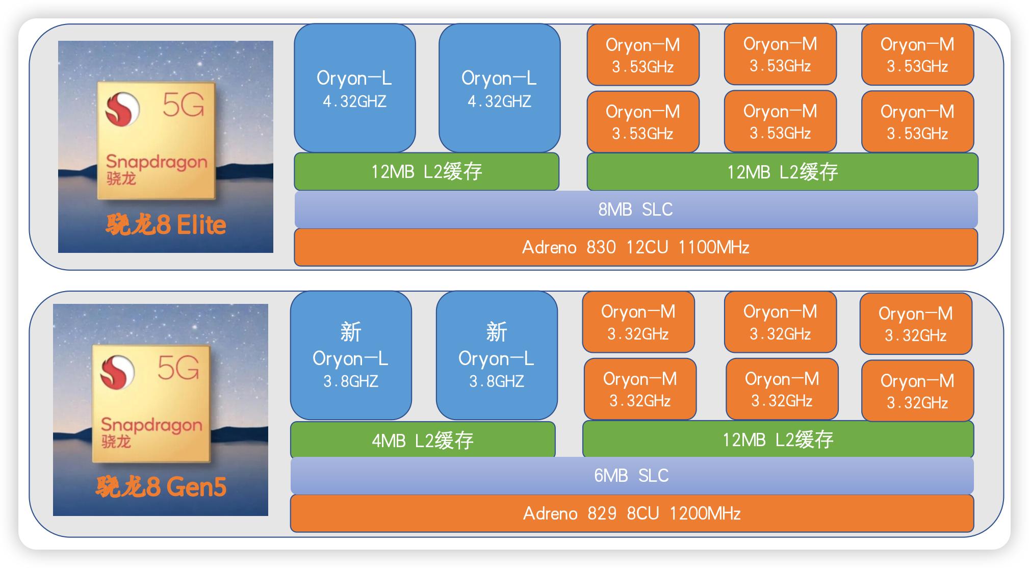 具体来说,骁龙8 Gen5的超大核心L2缓存只有4MB,SLC缓存6MB,GPU的CU单元为8个,骁龙8 Elite则分别是12MB,8MB和12个,而且其GPU的独立显存容量也更高。