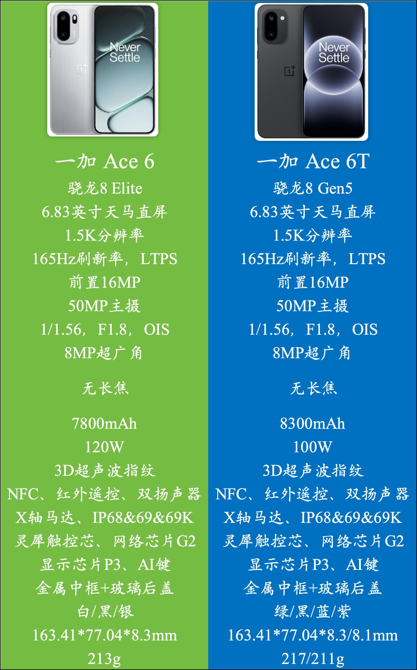 按照惯例先来个一图流,一加Ace 6T和一加Ace 6的具体配置情况看下面的图就行了。