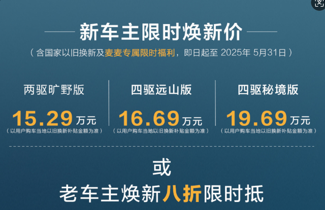 售价方面结合置换补贴和限时焕新补贴后,在2025年5月31日前订车的两驱旷野版15.29万,四驱秘境版19.69万。
