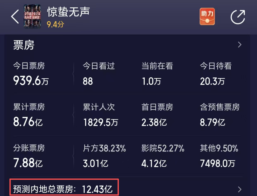 凭借张艺谋的号召力和易烊千玺等顶流阵容加持,影片首映斩获2.3亿票房,稳坐亚军宝座,然而次日票房断崖式下跌44%,仅有1.2亿,之后日票房持续滑坡,就连平台给出的预测总票房,也从最初的25亿降至12.4亿,豆瓣评分6.2,也成为春节档电影口碑垫底,想要逆袭太难了。