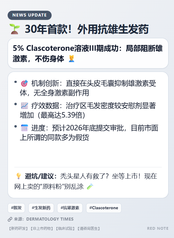 避坑:预计2026年底完成安全随访并递交审批,现阶段勿信市面任何"Clascoterone生发水"产品.