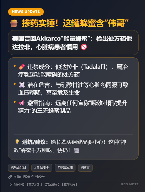 美企 Akkarco主动召回一种声称提升精力的蜂蜜制品,因被检出未申报处方药他达拉非