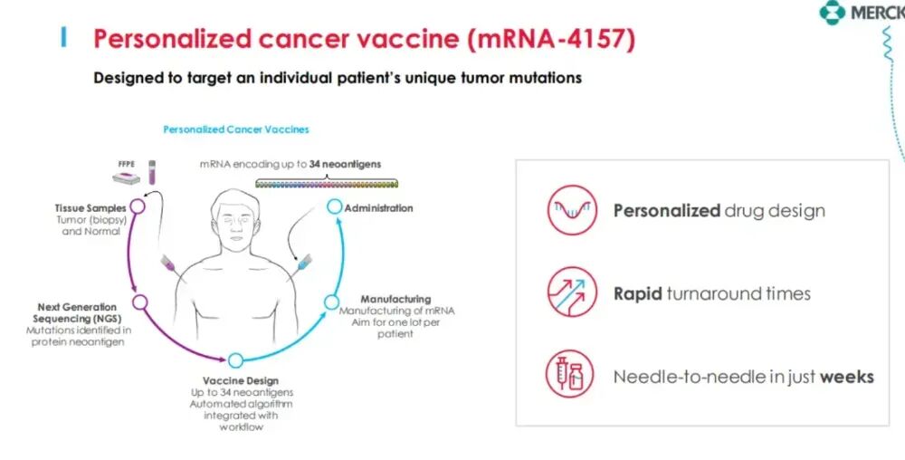 据《柳叶刀》2024 年发表的研究结果,mRNA-4157 联合默沙东的 PD-1 抑制剂 Keytruda,将高危黑色素瘤患者的复发或死亡风险降低了 44%,两年半总生存率达到 96%。FDA 已于 2023 年授予该联合疗法“突破性疗法”认定,三期试验已完成入组。