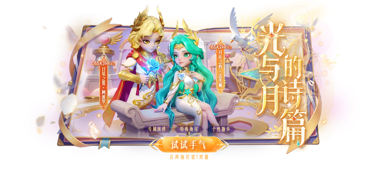 神话夺宝【光与月的诗篇】浪漫上线,专属演绎震撼太空!首两抽仅需1鸡腿,参与夺宝有机会获得限定头像框和限定情侣头像,为你的白色情人节增添色彩。