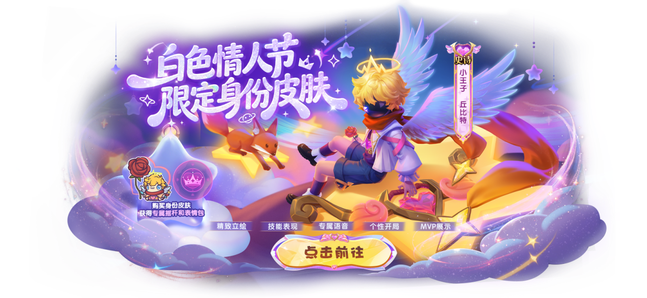 为庆贺丘比特觉醒,白色情人节身份皮肤【小王子】浪漫上线!现在入手享8折优惠,还赠送专属摇杆皮肤和表情!完成指定活跃任务还可领取鸡腿、幸运星、小卡背景等奖励。