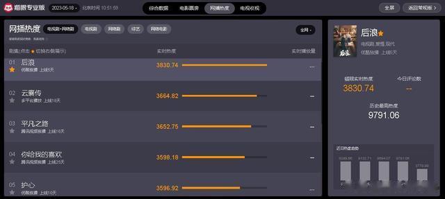 截至发文时间,从“猫眼专业版”实时数据显示可知,当前热播电视剧中,网播热度榜前五分别如下: