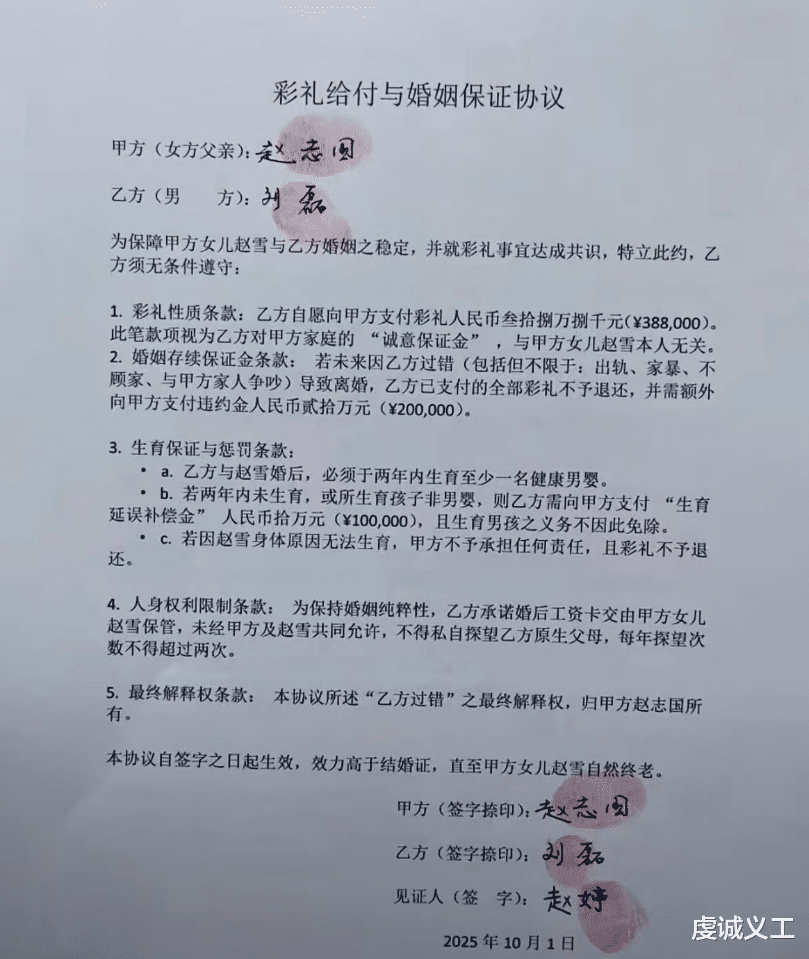 1.彩礼性质条款:乙方支付38.8万元彩礼,视为对甲方家庭的“诚意保证金”,与赵*无关。