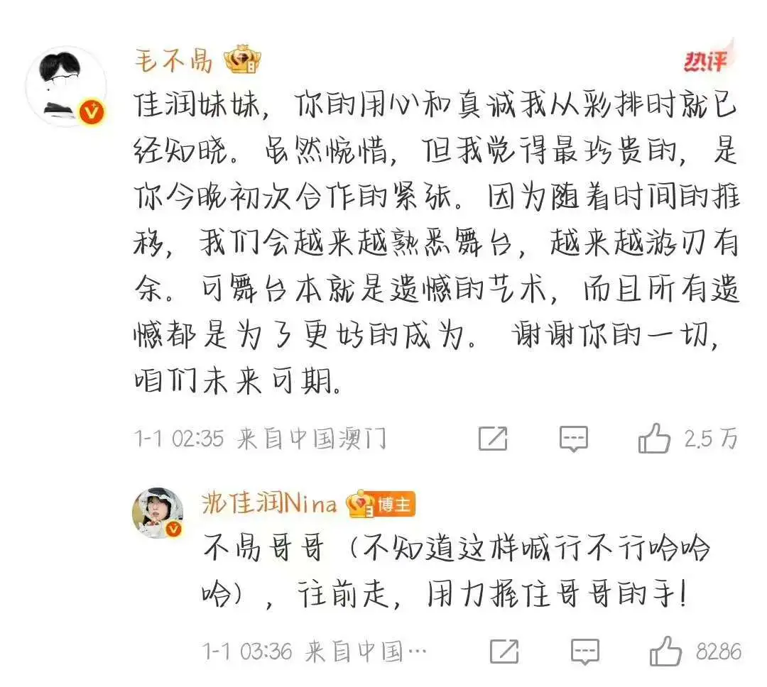 她还向毛不易道歉,说自己没有把彩排时的好状态呈现出来,让他担心,更是不忘感谢一路支持她的观众和粉丝粉丝们,表示自己还有很多的不足,在这新的一年里也会继续努力,能够变得很勇敢更坚强,在舞台上能更从容。