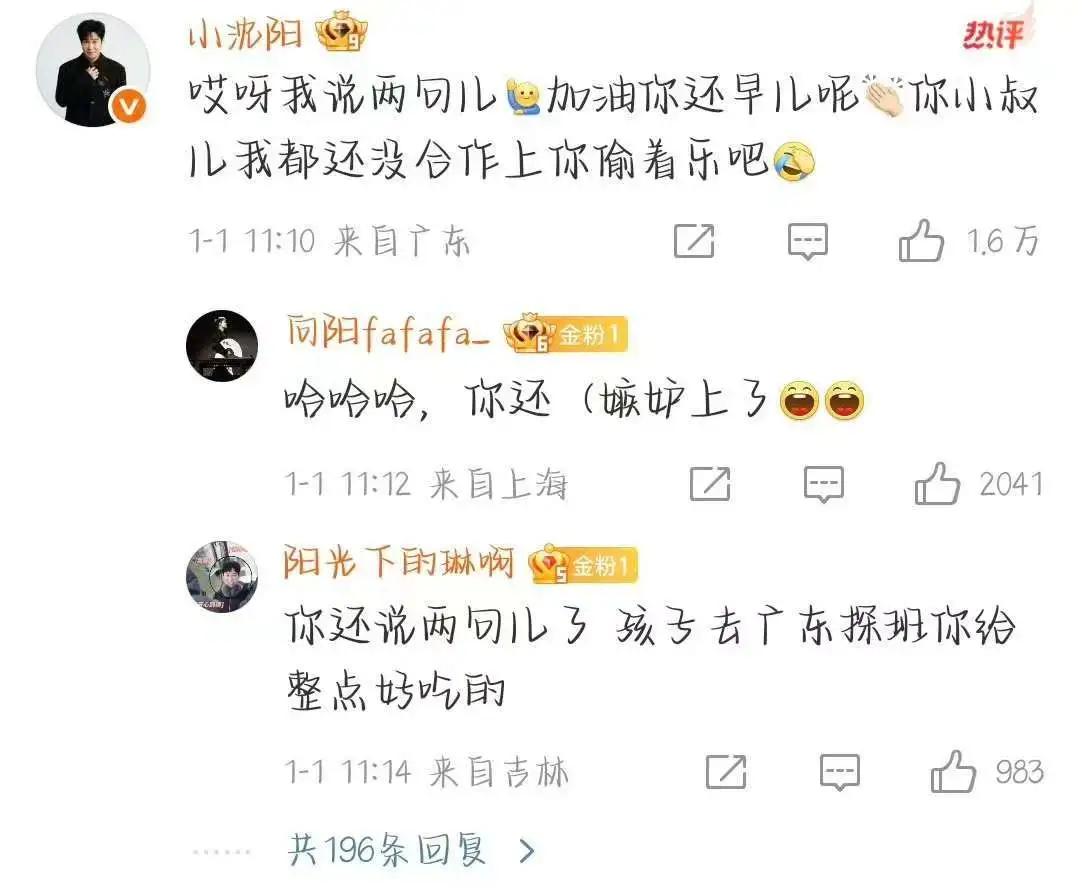随后小沈阳也现身评论区来安慰女儿!他调侃道:“哎呀我说两句儿,加油你还早儿呢,你小叔儿我都还没合作上你偷着乐吧!”