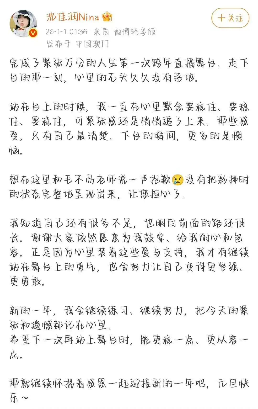 而在跨年晚会结束后,沈佳润很快发文回应了自己舞台上失误的行为。