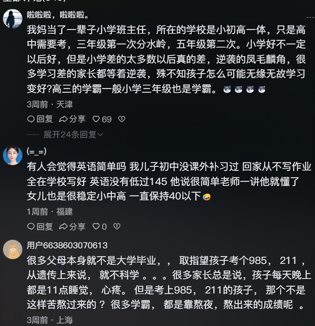 有网友说:我妈当了一辈子小学班主任,所在的学校是小初高一体,只是高中需要考,三年级第一次分水岭,五年级第二次。小学好不一定以后好,但是小学差的太多数以后真的差,逆袭的凤毛麟角,很多学习差的家长都等着逆袭,殊不知孩子怎么可能无缘无故学习变好?高三的学霸一般小学三年级也是学霸。